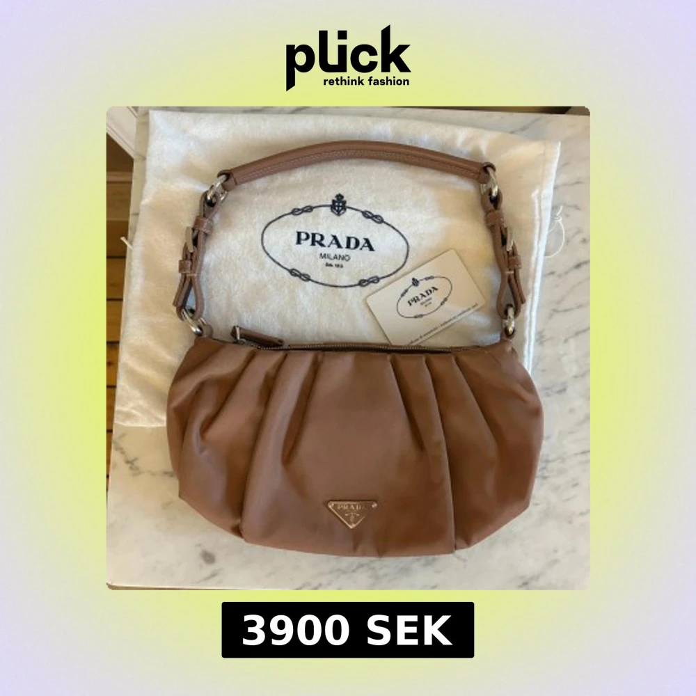 Säljer en beige axelväska från Prada med coola broderade och metalliska detaljer på ena sidan. Väskan har ett mjukt, veckat tyg och justerbar axelrem i matchande färg. Klassisk Prada-logga framtill och dragkedja upptill.