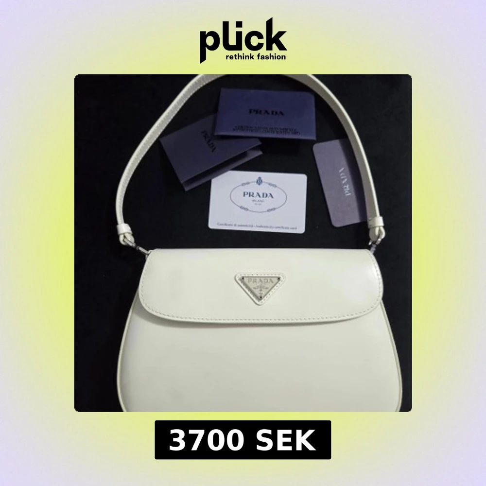 Snygg vit axelväska från Prada med klassisk, stilren design och silverfärgad logotyp på framsidan. Väskan är tillverkad i slätt skinn och har en enkel axelrem. Perfekt för dig som gillar minimalistisk och lyxig stil.Den har några fläckar på baksidan, som syns på bilderna. Jag köpte den från Vinted.