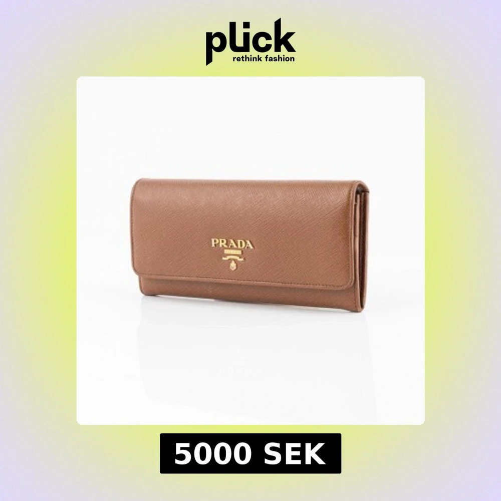 Elegant brun plånbok från Prada i skinn med guldiga detaljer. Den har en praktisk dragkedja på baksidan och det ikoniska Prada-logotypen på framsidan. Perfekt för att hålla dina kort och kontanter organiserade. 100 äkta köpt på bukowskis.