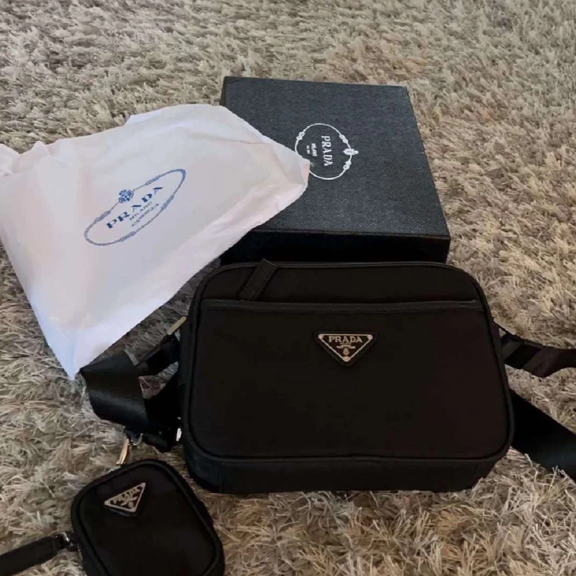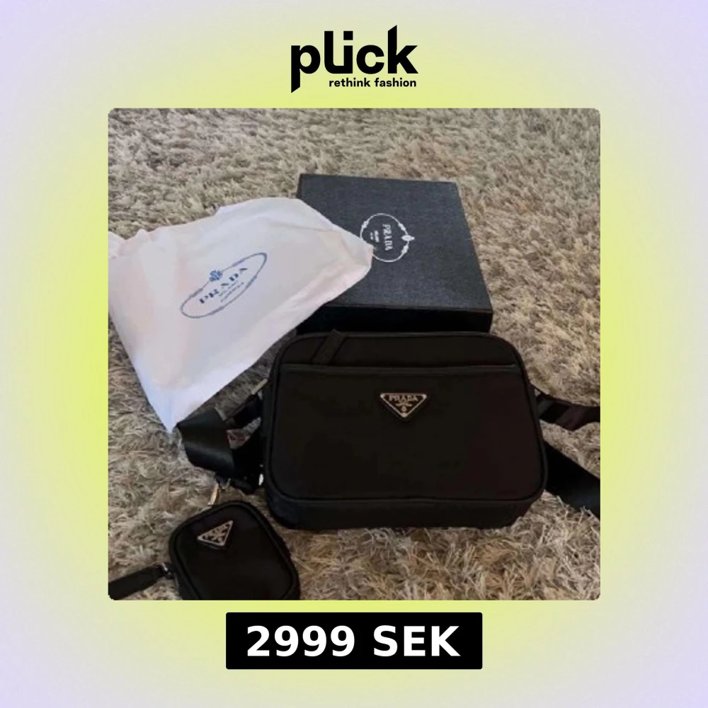 Säljer en svart axelväska från Prada med klassisk trekantslogga i metall framtill. Väskan har justerbar axelrem och en mindre avtagbar ficka. Tillverkad i slitstark nylon med snygga detaljer. Perfekt för dig som vill ha en stilren och lyxig väska.