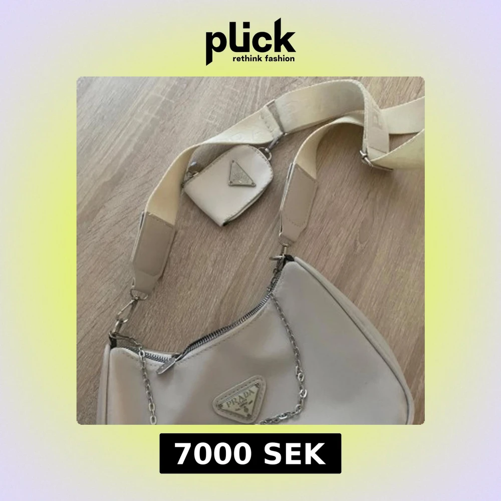 Säljer en beige axelväska från Prada med bred axelrem och silverfärgad kedjedetalj. Väskan har en liten matchande miniväska fäst på remmen och klassisk Prada-logga framtill. Perfekt för dig som vill ha en stilren och trendig accessoar.