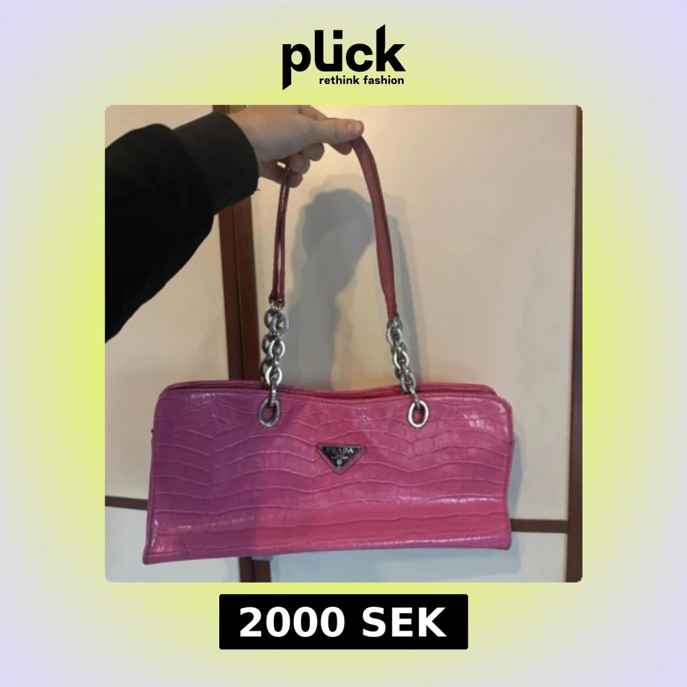 Säljer en rosa handväska från Prada i croco-präglat skinn med silverfärgade kedjedetaljer på handtagen. Väskan har en avlång form och klassisk Prada-logga framtill. Perfekt för dig som vill sticka ut med en färgglad accessoar. Vintage och ovanlig, jag är inte säker på om den är äkta!
