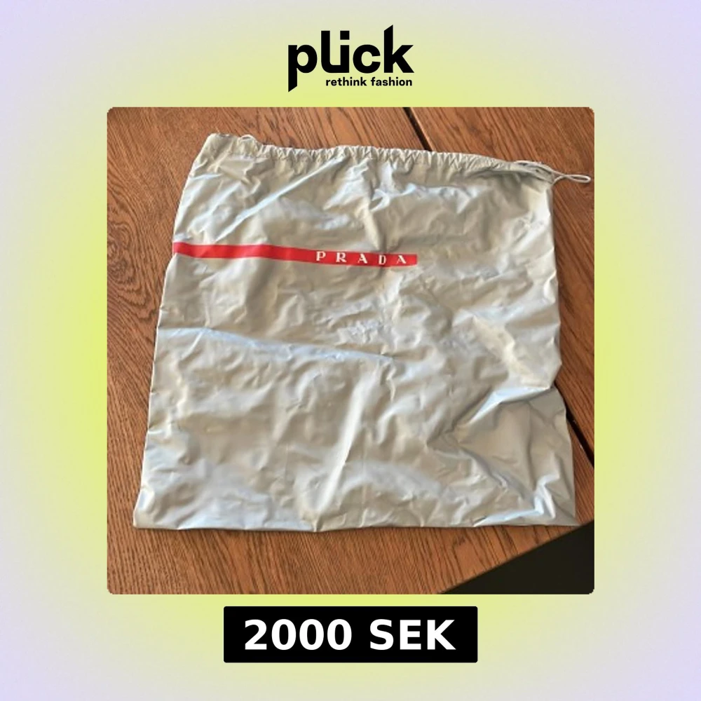 Säljer en stilren grå påse från Prada med röd logga. Perfekt för att förvara eller transportera dina tillhörigheter. Påsen har en praktisk dragsko för enkel stängning.