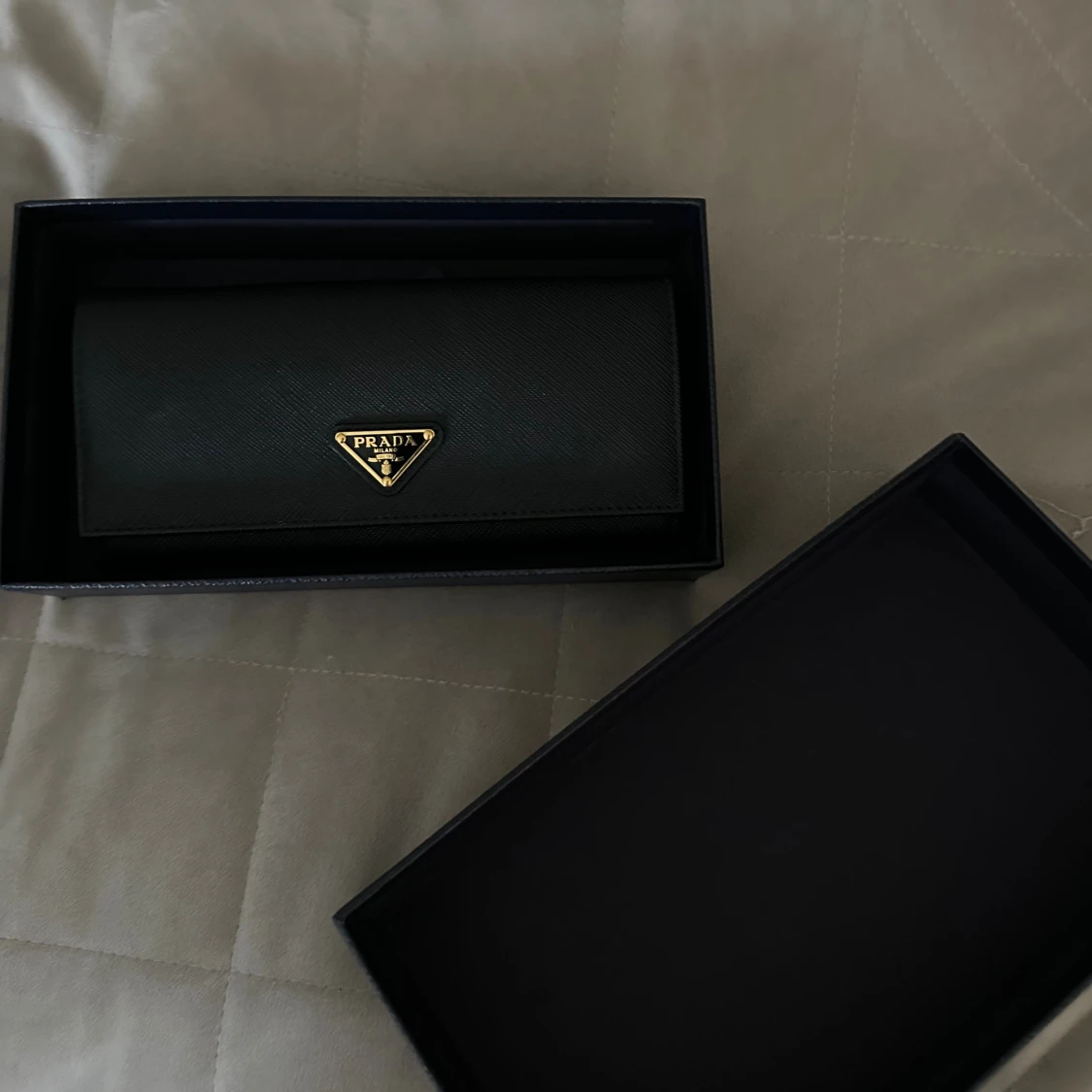 Säljer en svart plånbok från Prada i exklusivt skinn med guldiga detaljer och klassiskt trekantsmärke framtill. Plånboken har flera fack, dragkedja och stilren design. Perfekt för dig som vill ha något lyxigt och tidlöst i väskan.