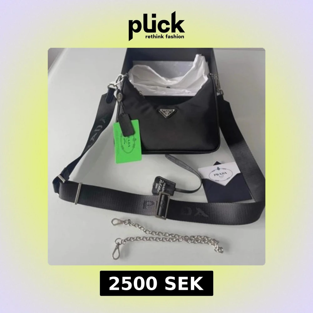 Snygg svart axelväska från Prada med justerbar rem och silverfärgade metalldetaljer. Väskan är tillverkad i slitstarkt nylon och har det klassiska Prada-emblemet framtill. Medföljer en liten avtagbar ficka och kedja för extra stilpoäng.