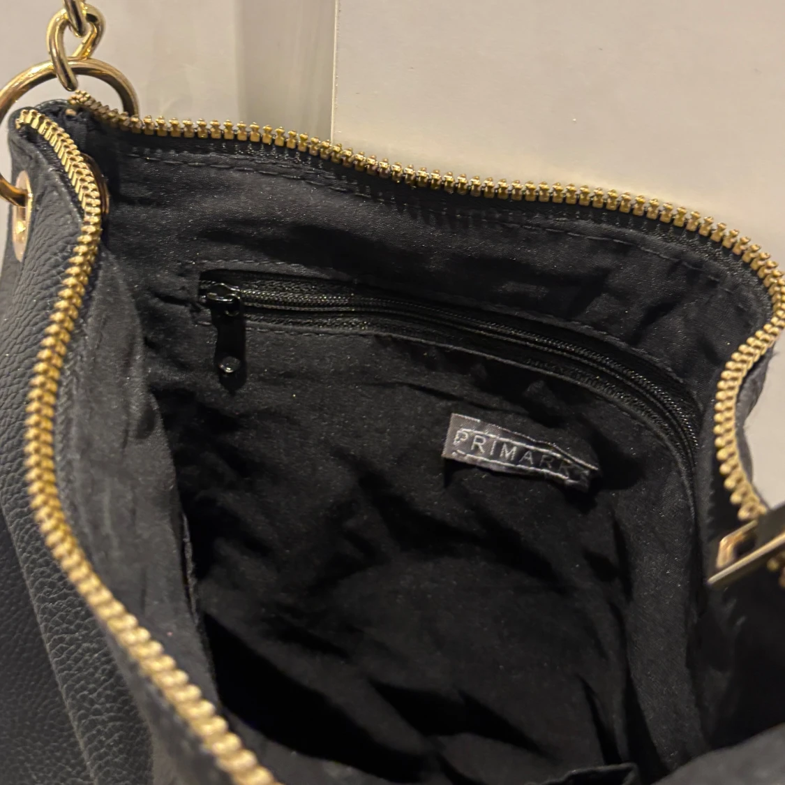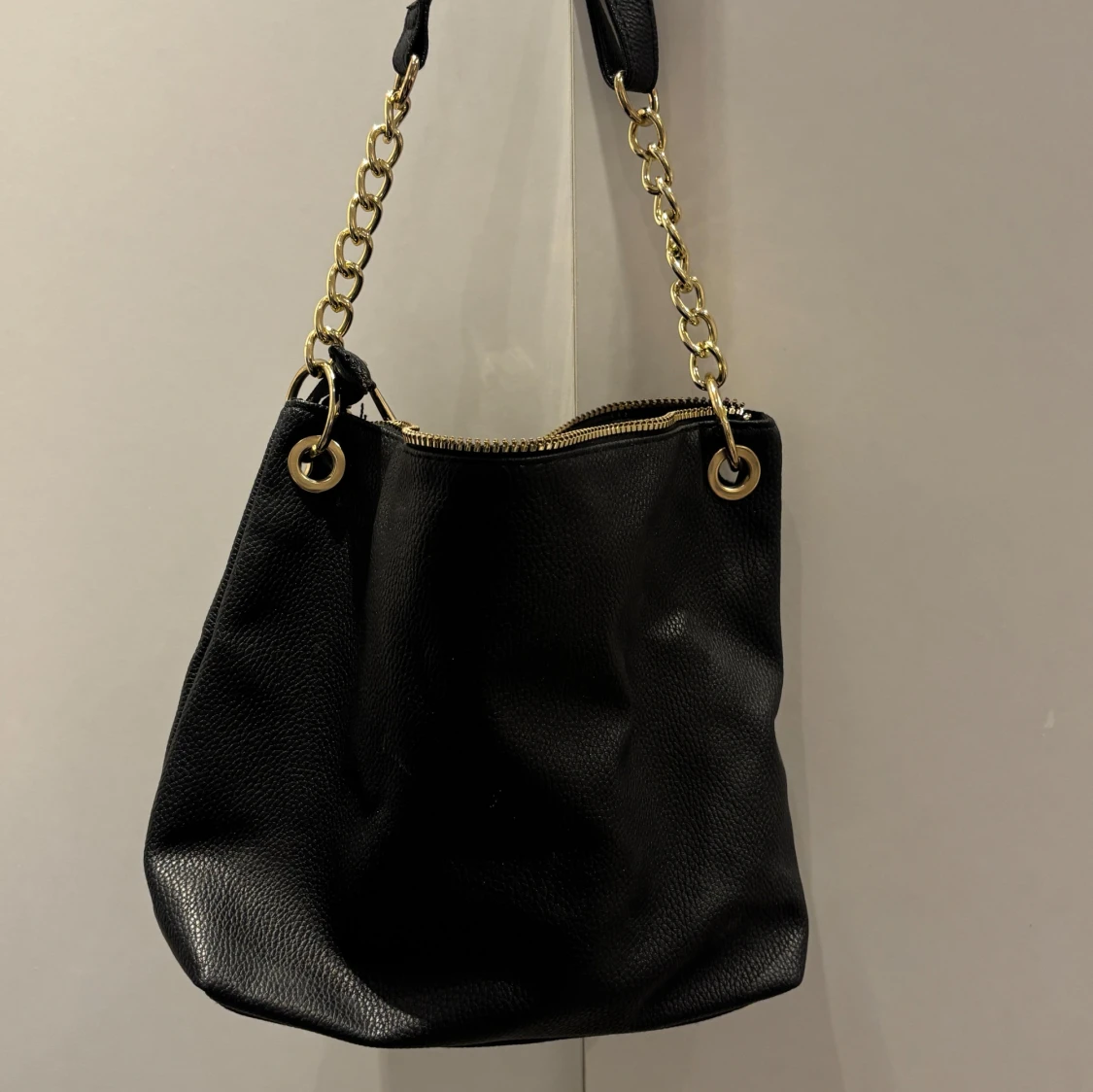 Säljer en svart axelväska med guldfärgade kedjedetaljer och dragkedja upptill. Väskan har två dragkedjefickor framtill och justerbar axelrem. Perfekt för att bära dina viktigaste saker med stil.