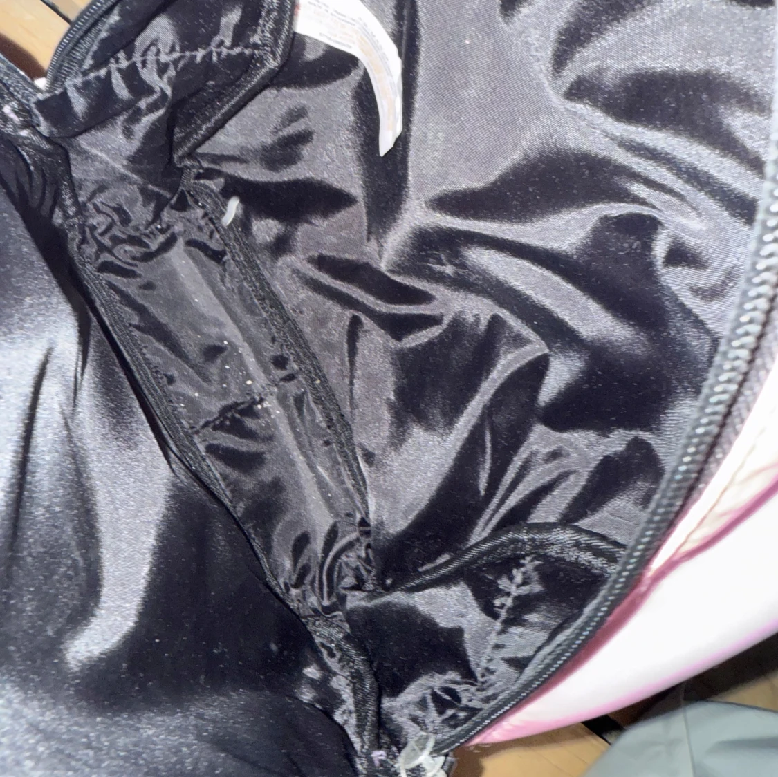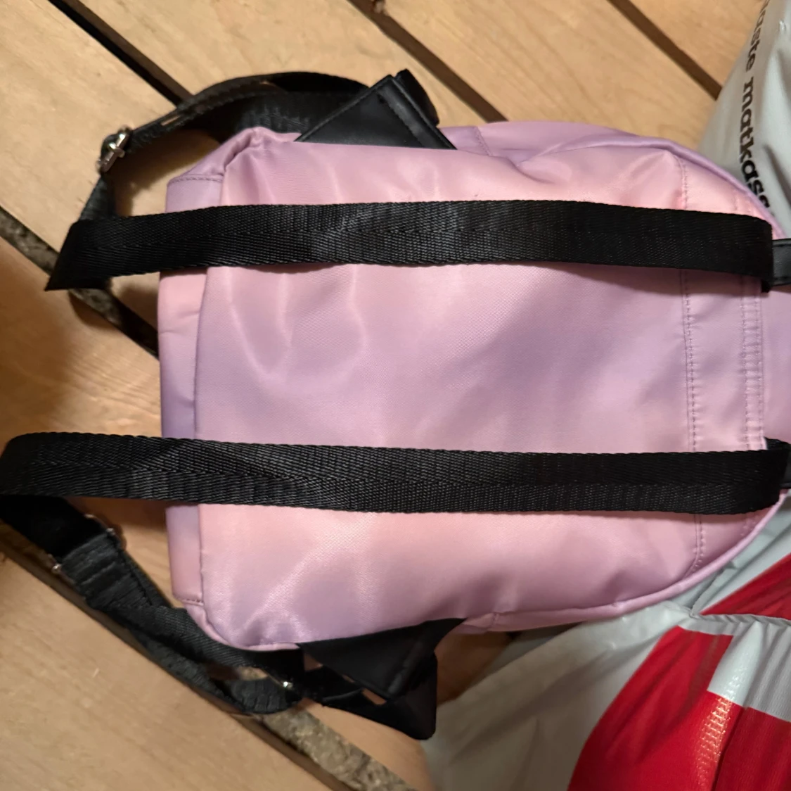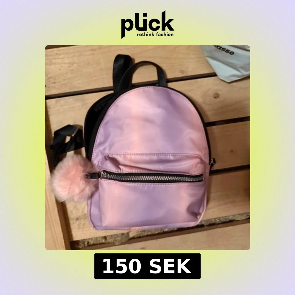 Söt liten ryggsäck i ljusrosa syntetmaterial med svarta axelband och dragkedja framtill. Väskan har en fluffig rosa boll som dekoration på dragkedjan och ett rymligt svart innerfoder. Perfekt för dig som vill ha en gullig och praktisk accessoar.