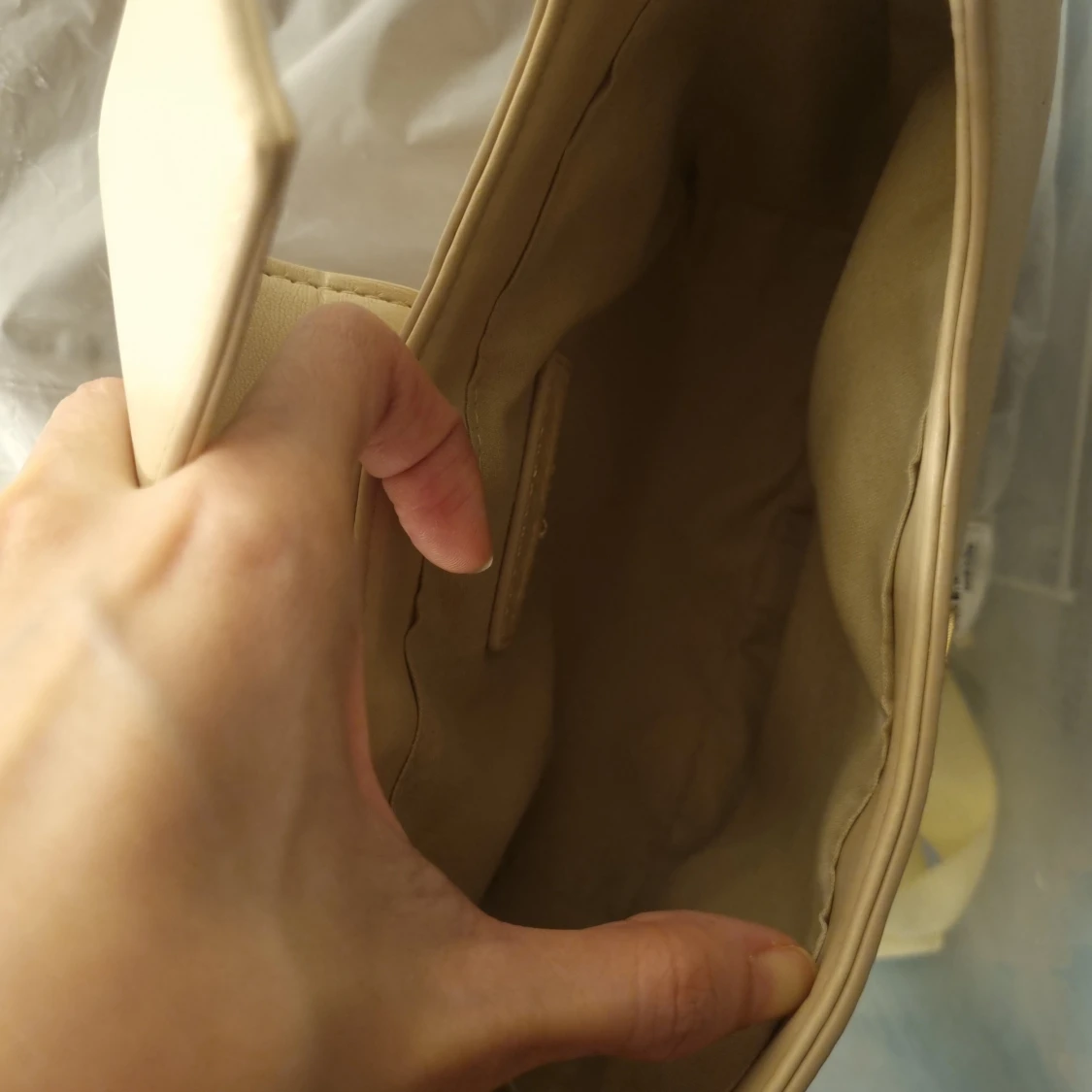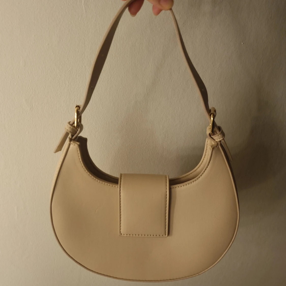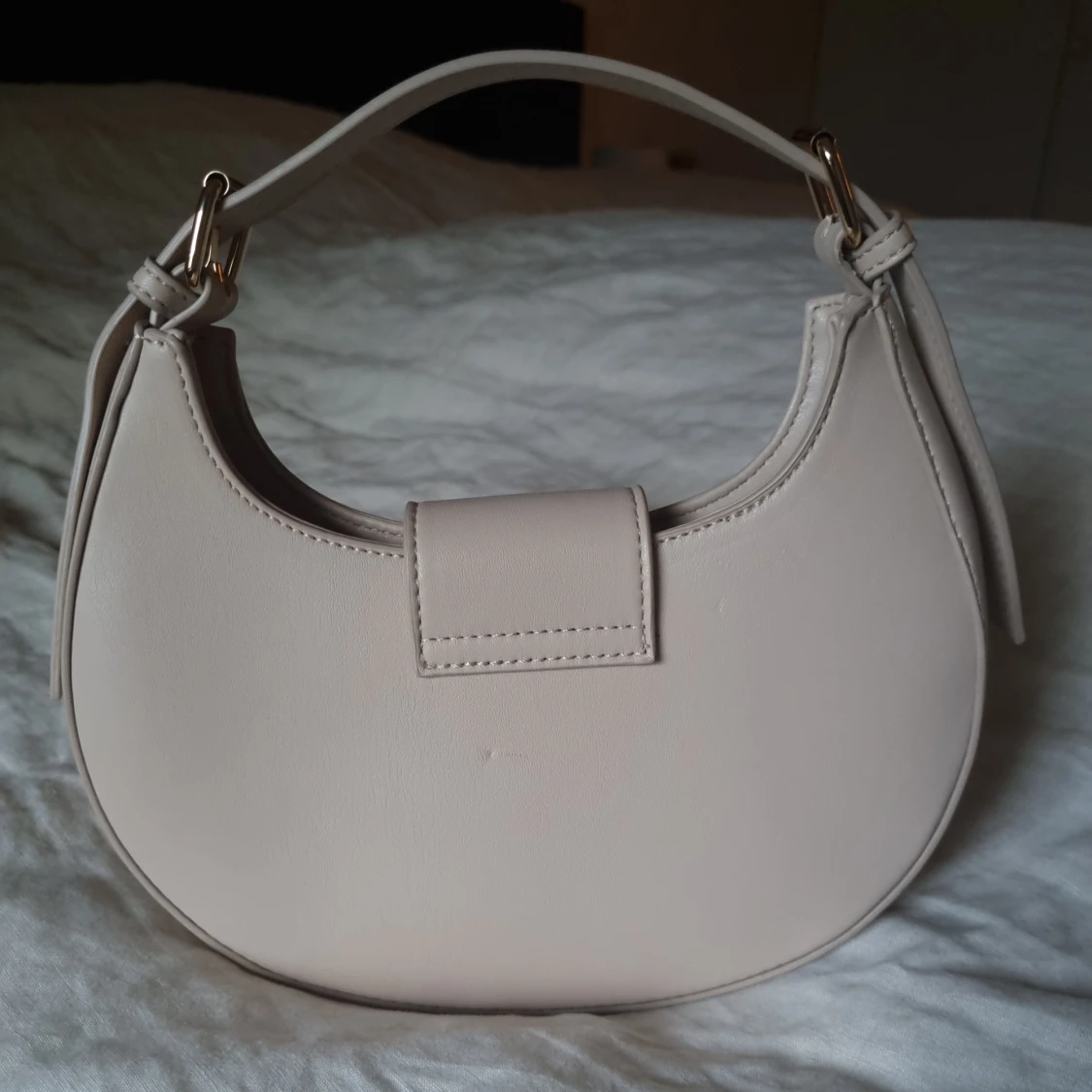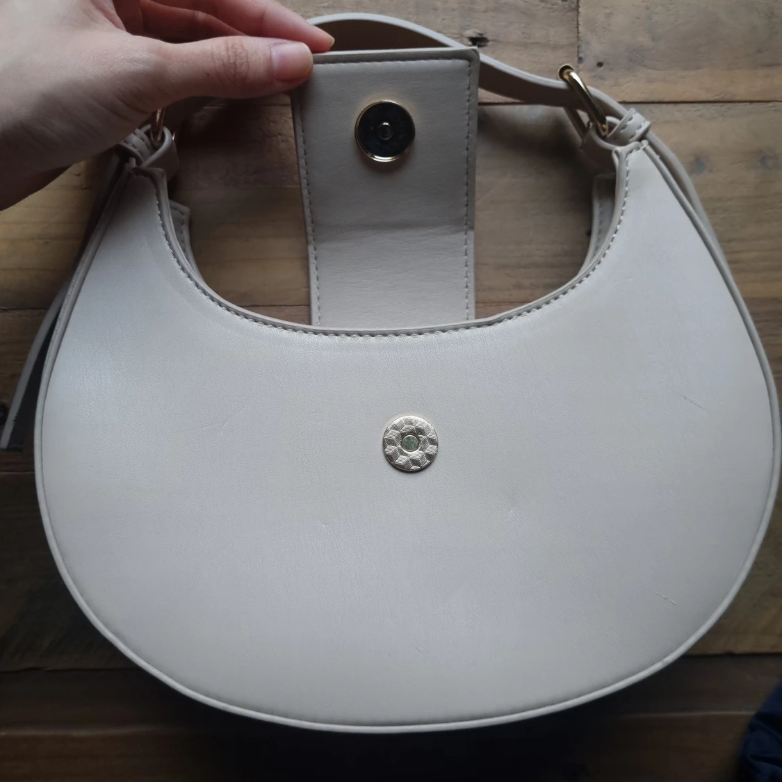 The Irie Stone PU Circular Buckle Strap Grab Bag från Public Desire i neutral färg. Axelrem kan justeras. Spåret av användning finns. Mått 23 x 18 x 7 cm