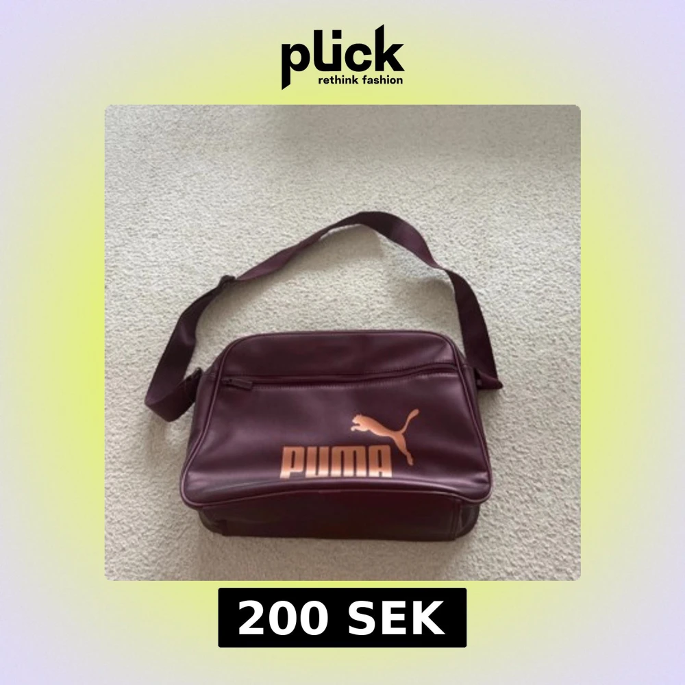 Säljer en lila träningsväska från Puma med justerbar rem och stort logotryck i brons färg på framsidan. Väskan har dragkedja, ett stort huvudfack och extra fack framtill.