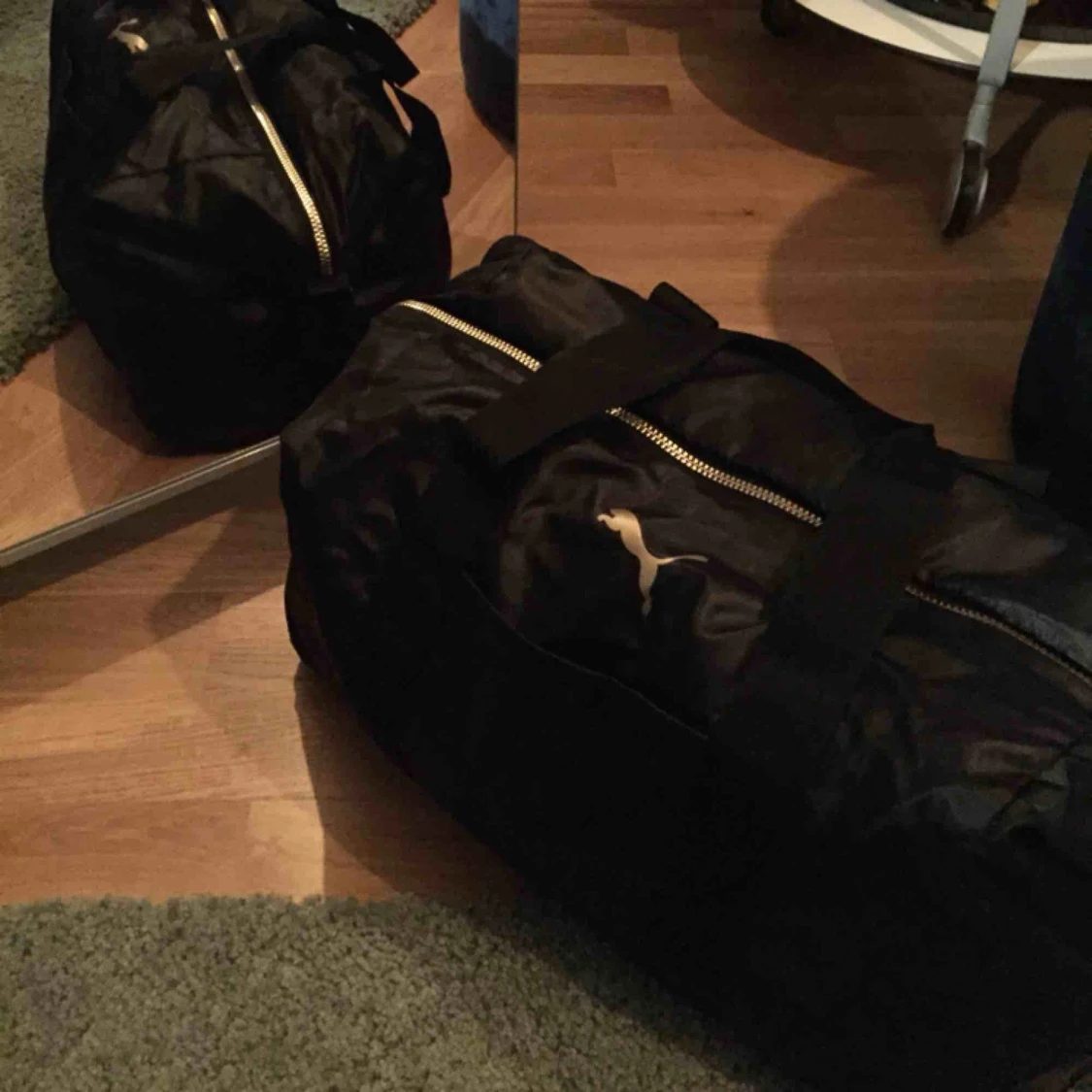 Svart Puma väska med guldiga detaljer! Denna väska är i en perfekt storlek enligt mig eftersom att den är lite mindre än de vanliga träningsväskorna. Väldigt bra skick då den sällan kom till användning🥰köpt för 999kr Pris kan diskuteras