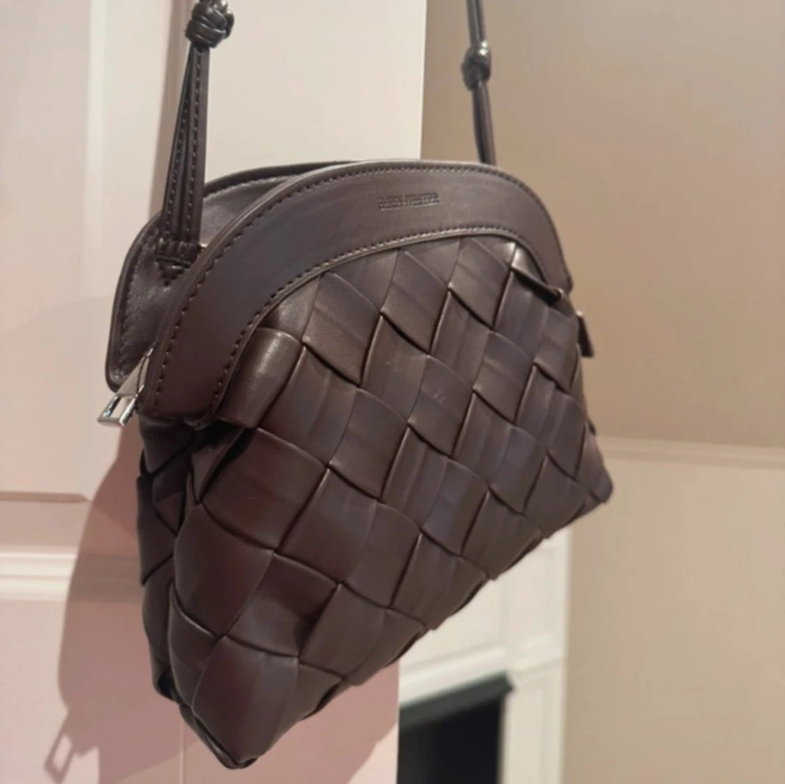 Snygg brun axelväska med flätad design och justerbar axelrem. Väskan är tillverkad i skinnimitation och har en dragkedja upptill. Perfekt storlek för det viktigaste och ger en trendig touch till din outfit.