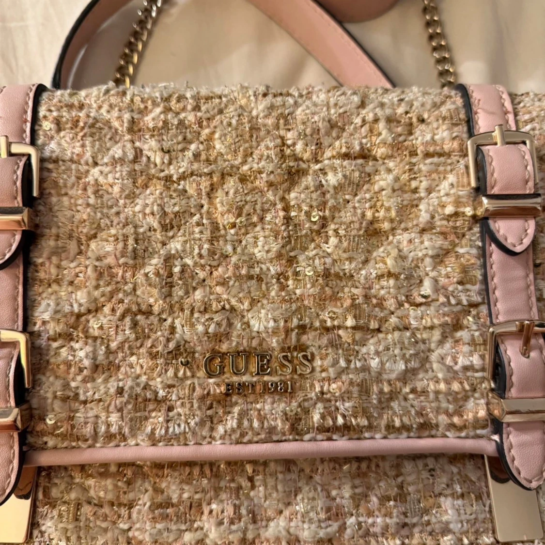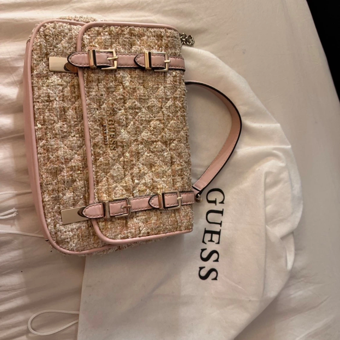 Superfin axelväska från Guess i beige och ljusrosa tweed med quiltad struktur och glittriga detaljer. Väskan har snygga spännen, kedjerem och flera fack inuti. Perfekt för dig som vill ha en chic och trendig look. Använd endast en gång. Köpte för 1250kr
