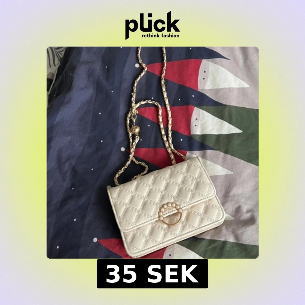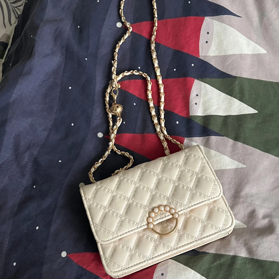 Snygg beige axelväska med quiltat mönster och guldfärgad kedja. Väskan har ett dekorativt spänne med pärlor framtill och stilren, rektangulär form. Perfekt för dig som vill ha en trendig och elegant accessoar till din outfit.
