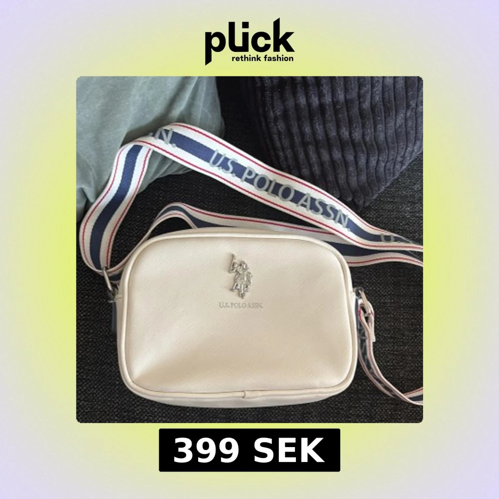 Snygg vit axelväska från U.S. Polo Assn med silverfärgad logga framtill. Väskan har en bred, justerbar axelrem med blå och röda detaljer samt märkets namn tryckt längs hela remmen. Tillverkad i syntetmaterial och stängs med dragkedja.