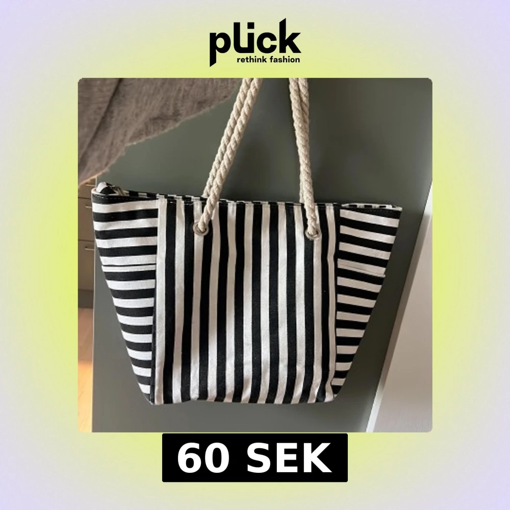 Stor svartvit shoppingväska med breda och smala ränder. Väskan har rejäla rep-handtag i vitt och är tillverkad i ett kraftigt bomullstyg. Perfekt för att bära med sig allt man behöver till stranden eller stan.