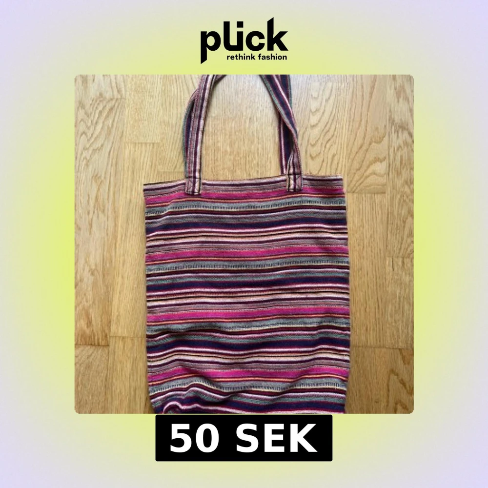 Färgglad shoppingväska från Indiska med randigt mönster i rosa, vinrött, beige, blått och grönt.