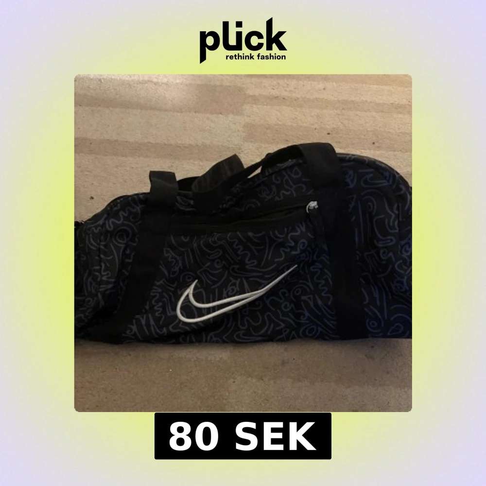 Säljer en svart sportväska från Nike med ett unikt abstrakt mönster i blått. Väskan har en praktisk dragkedja och ett stort huvudfack för enkel förvaring. Perfekt för träning eller resor.