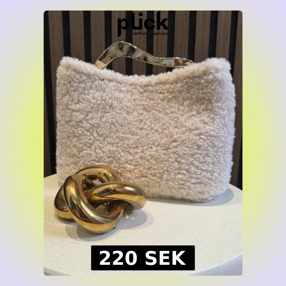Supersnygg beige handväska i fluffigt syntetmaterial med unikt vågigt metallhandtag och vita detaljer. Perfekt accessoar för dig som vill sticka ut och addera lite lyxig känsla till din outfit. Väskan har en mjuk, fårullsinspirerad look och känns riktigt trendig.