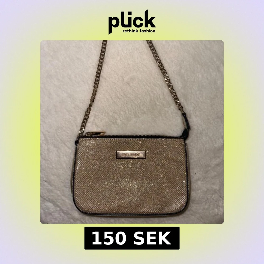 Snygg glittrig axelväska från River Island med en kedjerem och dragkedja. Perfekt för att ge en touch av glamour till din outfit. Väskan är i en elegant guldton och har en praktisk storlek för det viktigaste.