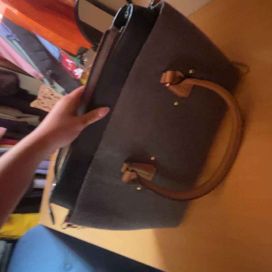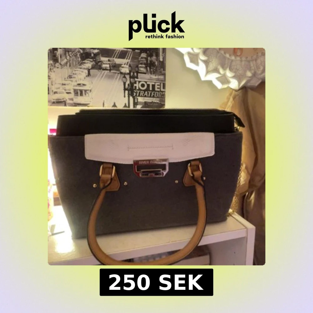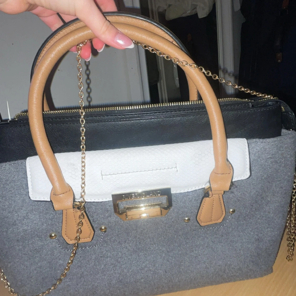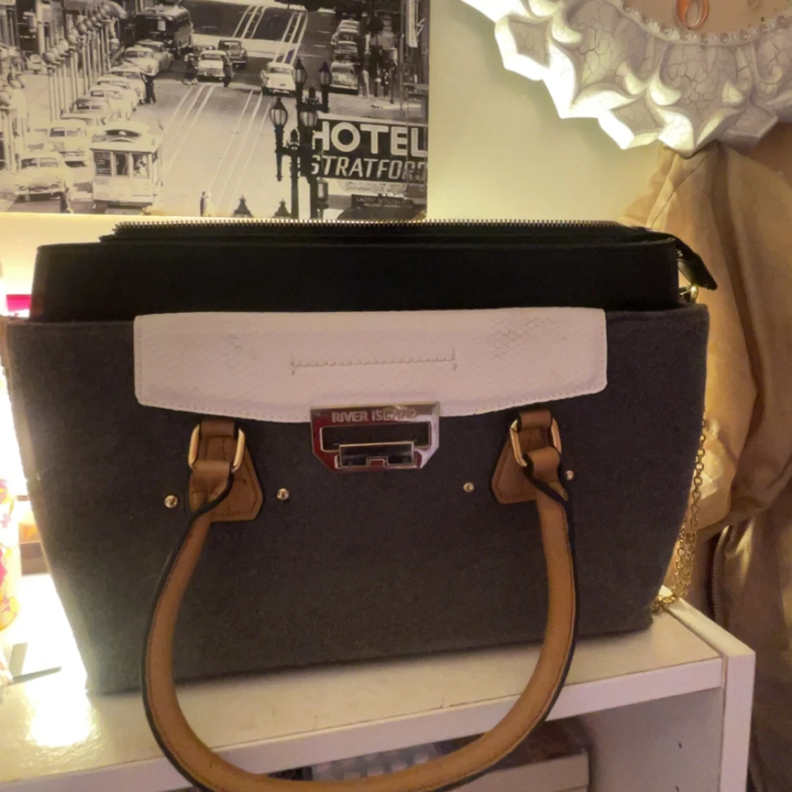Snygg handväska från River Island i grå filt med svarta och vita detaljer. Väskan har ljusbruna handtag i skinnimitation, guldfärgad kedja och dragkedja upptill. Perfekt storlek för allt du behöver och stilren design med metallogo framtill.