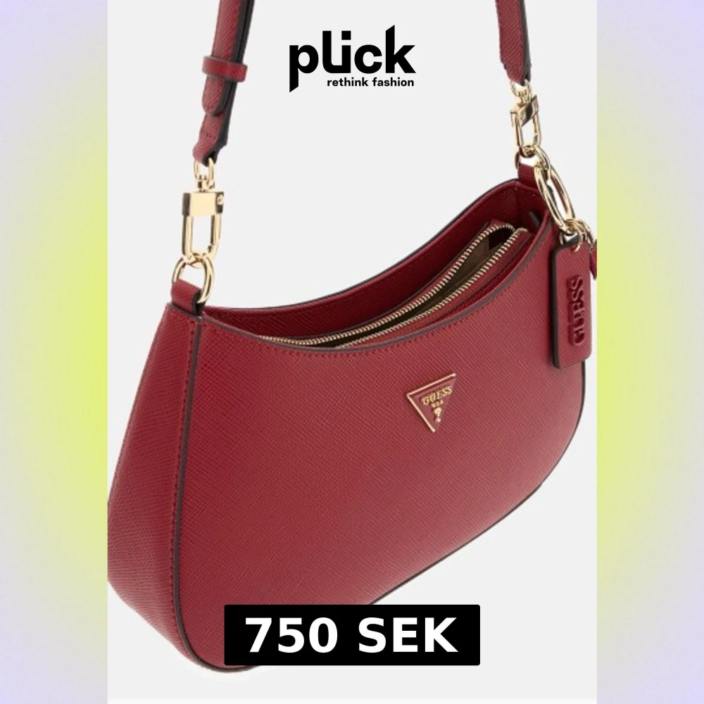 Snygg röd axelväska från Guess med guldfärgade metalldetaljer och klassisk trekantig logga framtill. Väskan har struktur i materialet, dragkedja upptill och en tag med Guess-logga hängande vid sidan. Perfekt storlek för det viktigaste.