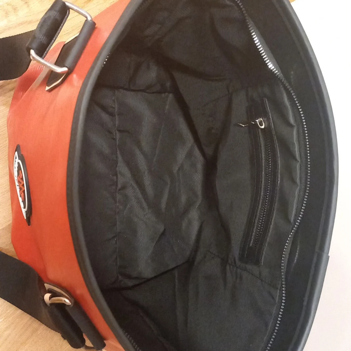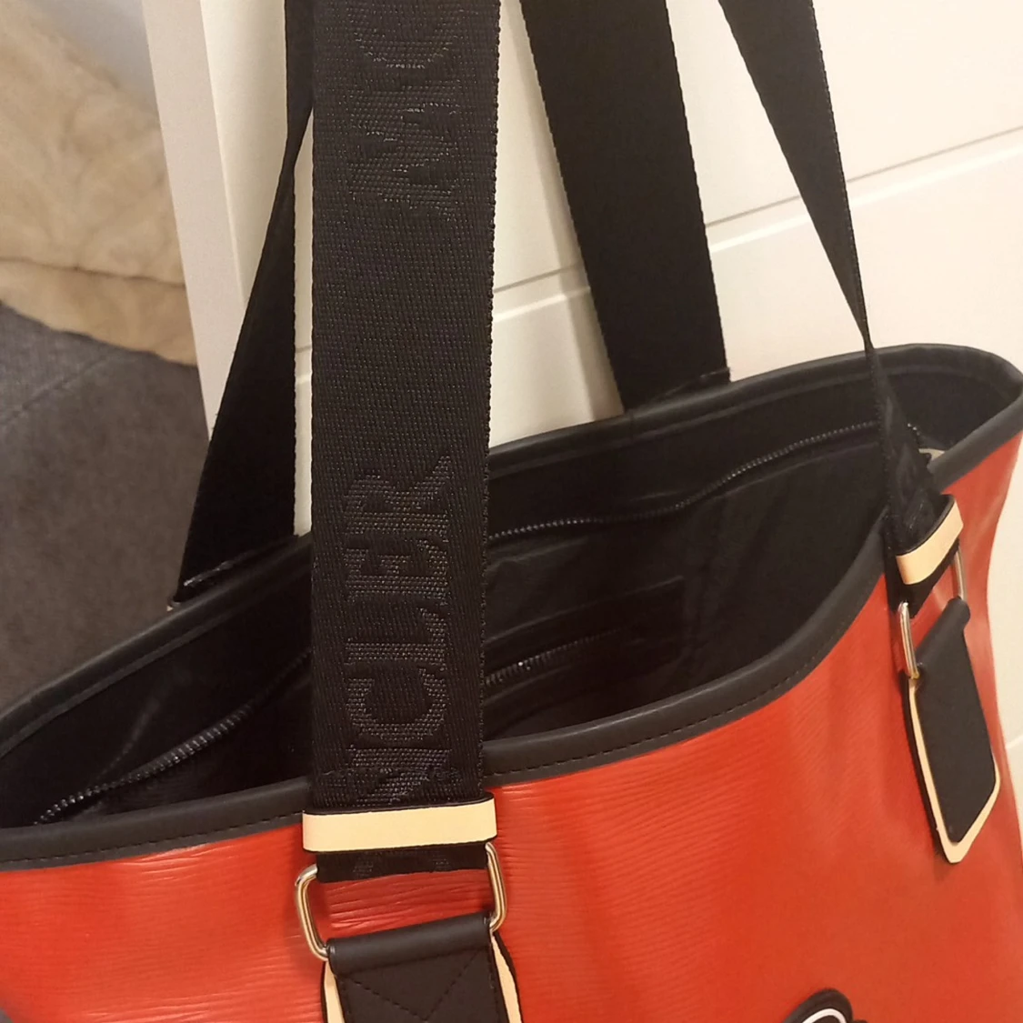 Cool röd axelväska från Moncler med svart logotyp framtill. Väskan har breda svarta axelband med Moncler-tryck, svarta detaljer och dragkedja upptill. Tillverkad i syntetmaterial med rymligt fack och innerficka med dragkedja. Vattentålig!