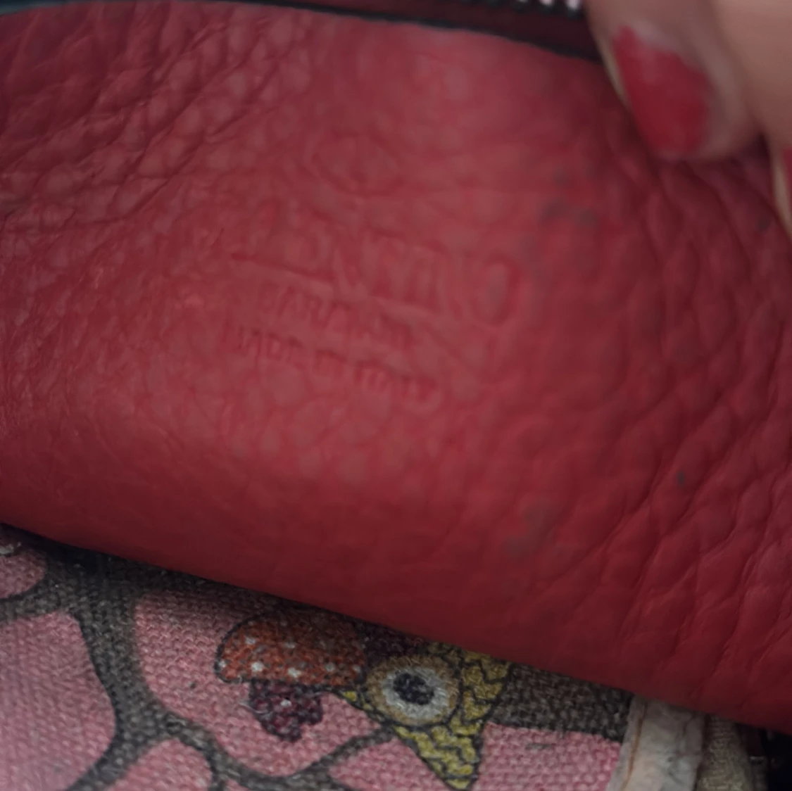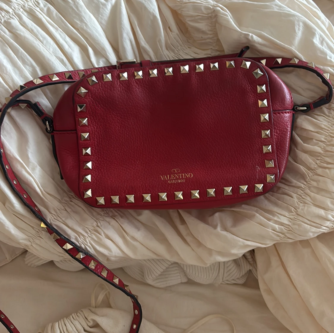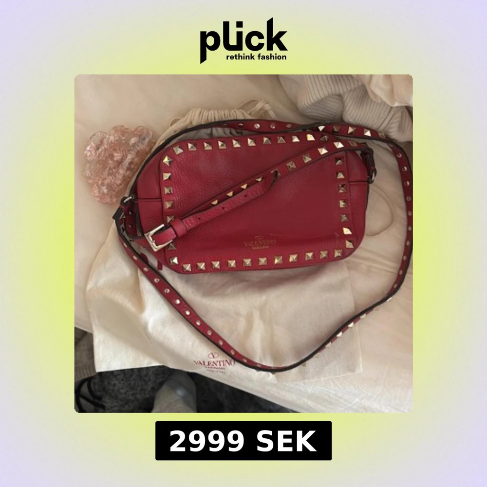 Snygg röd axelväska från Valentino Garavani i äkta skinn med coola nitar runt kanterna och på axelremmen. Väskan har en mjuk, rundad form och justerbar rem. Perfekt för dig som gillar statement-accessoarer och vill sticka ut med lyxig design. Pris kan diskuteras