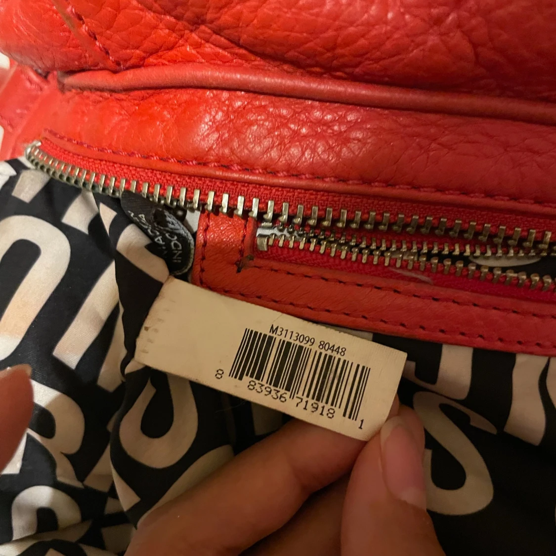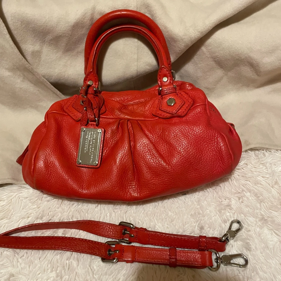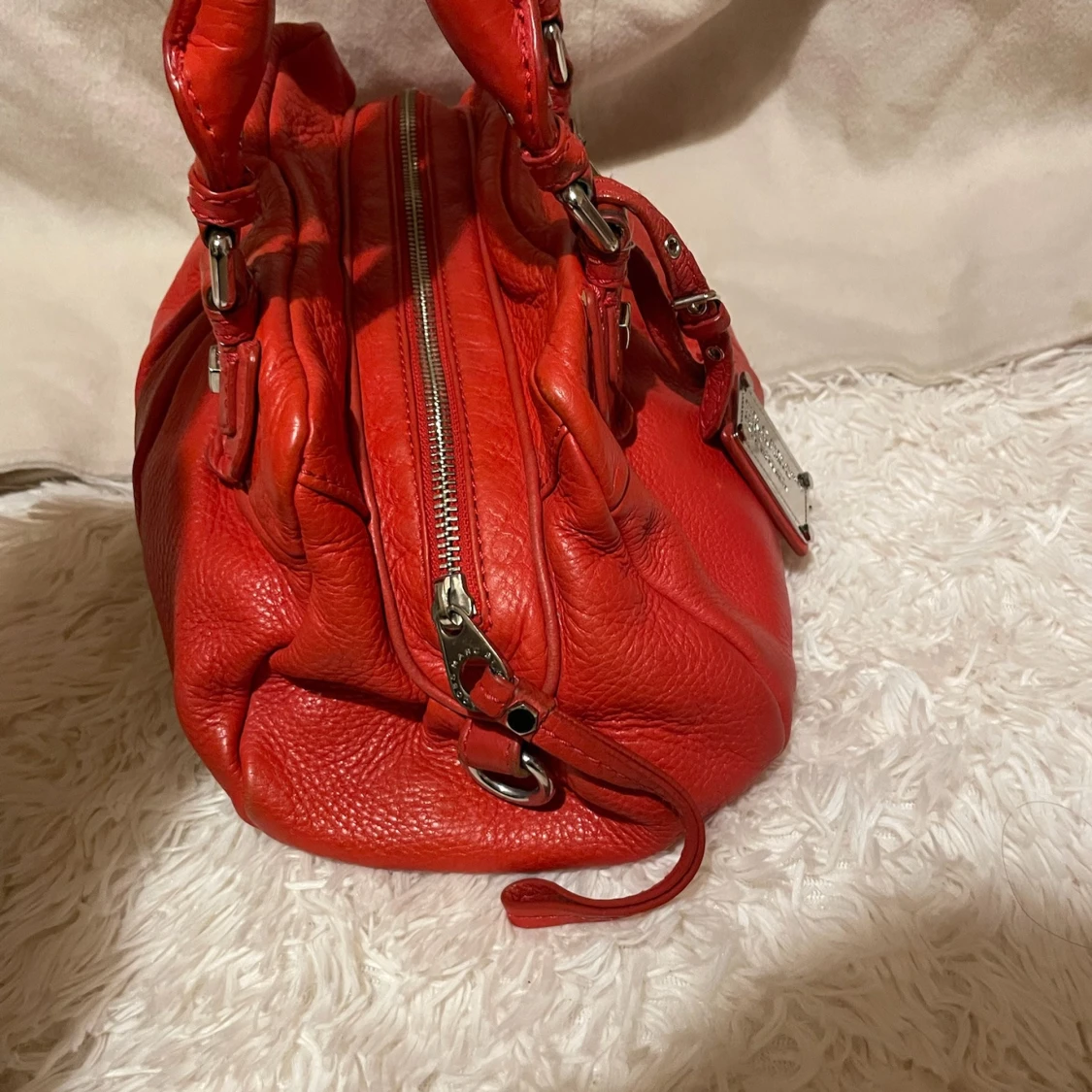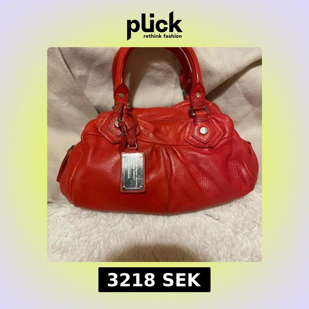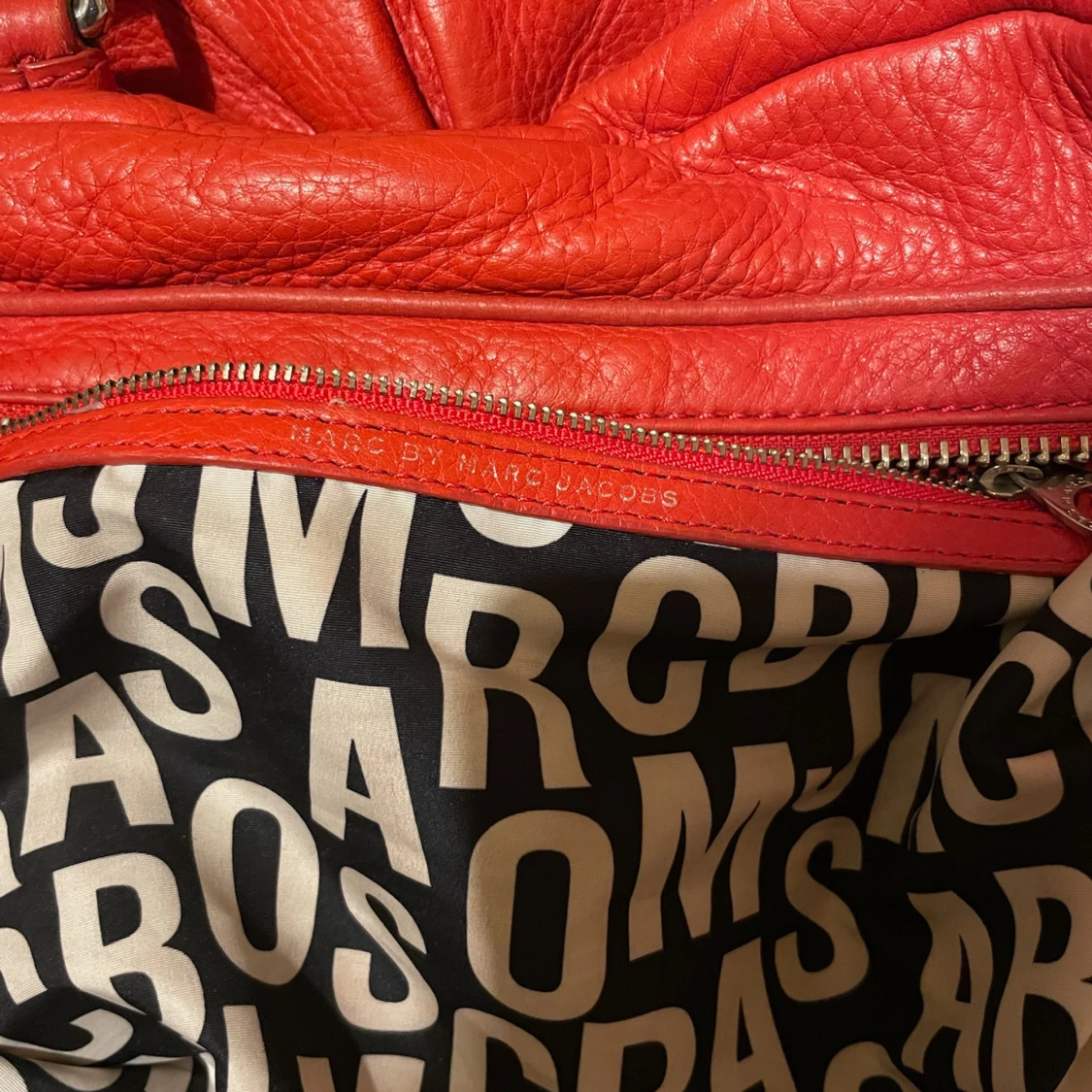 Säljer en snygg röd handväska från Marc by Marc Jacobs i äkta skinn. Väskan har silverfärgade metalldetaljer, dubbla handtag och avtagbar axelrem. Insidan är fodrad med svartvitt mönster och har dragkedja. Perfekt för dig som vill sticka ut med en färgstark accessoar.
