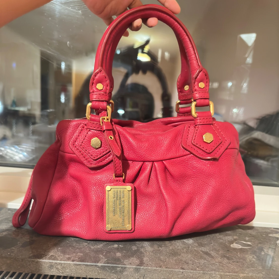 Cool röd handväska i mjukt skinn från Marc by Marc Jacobs med guldfärgade metalldetaljer och dekorativ loggoplatta framtill. Väskan har dubbla handtag, dragkedja upptill och snygga veckade detaljer på framsidan.