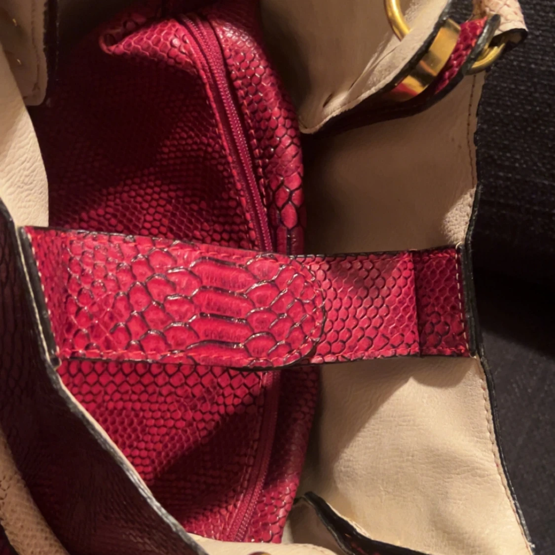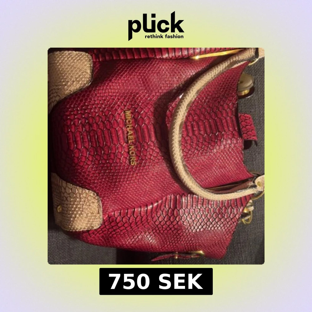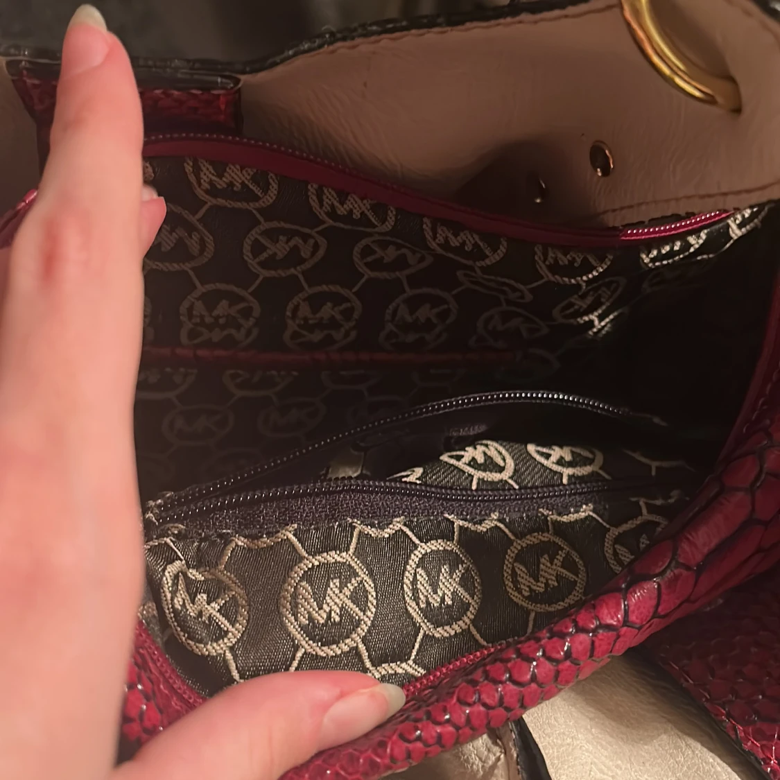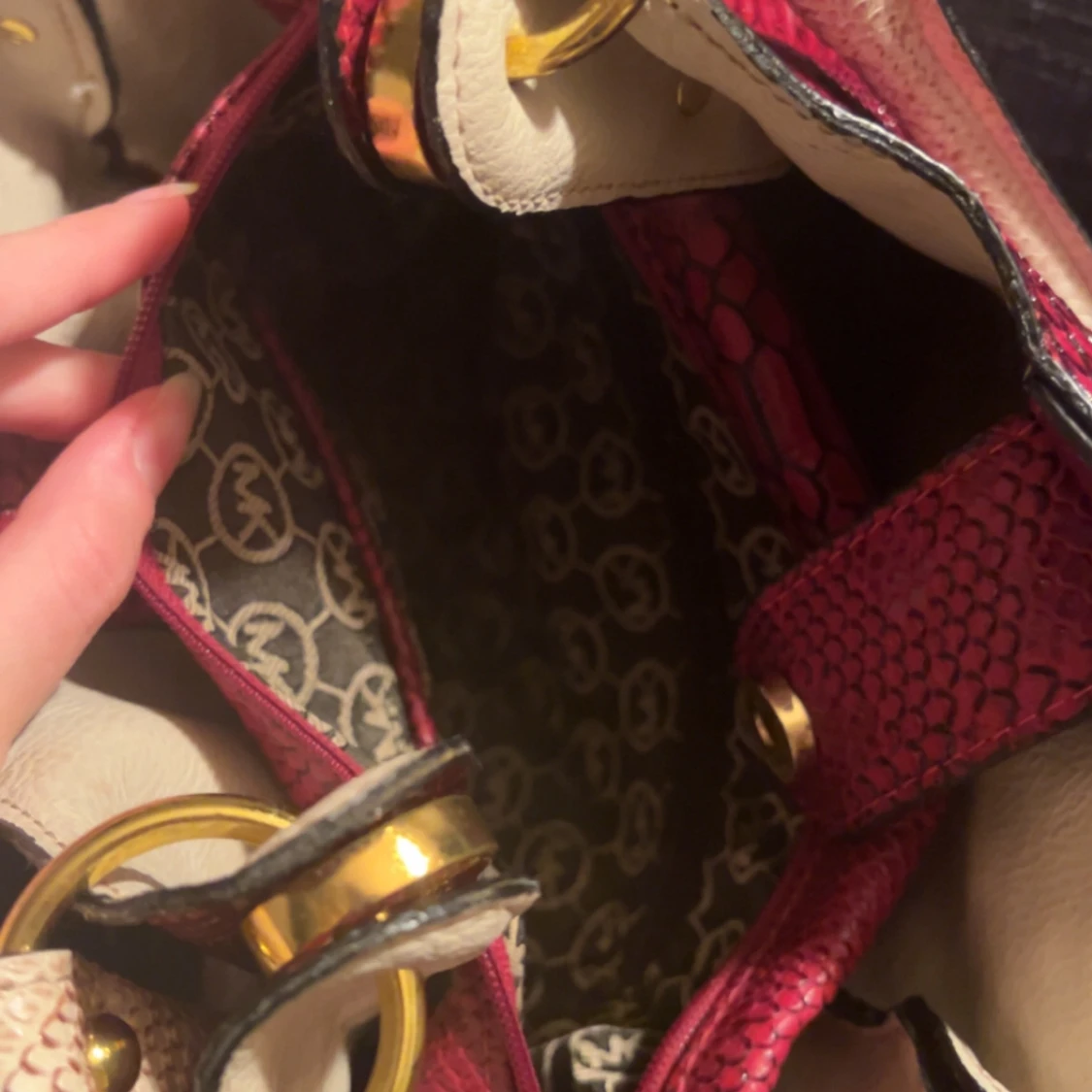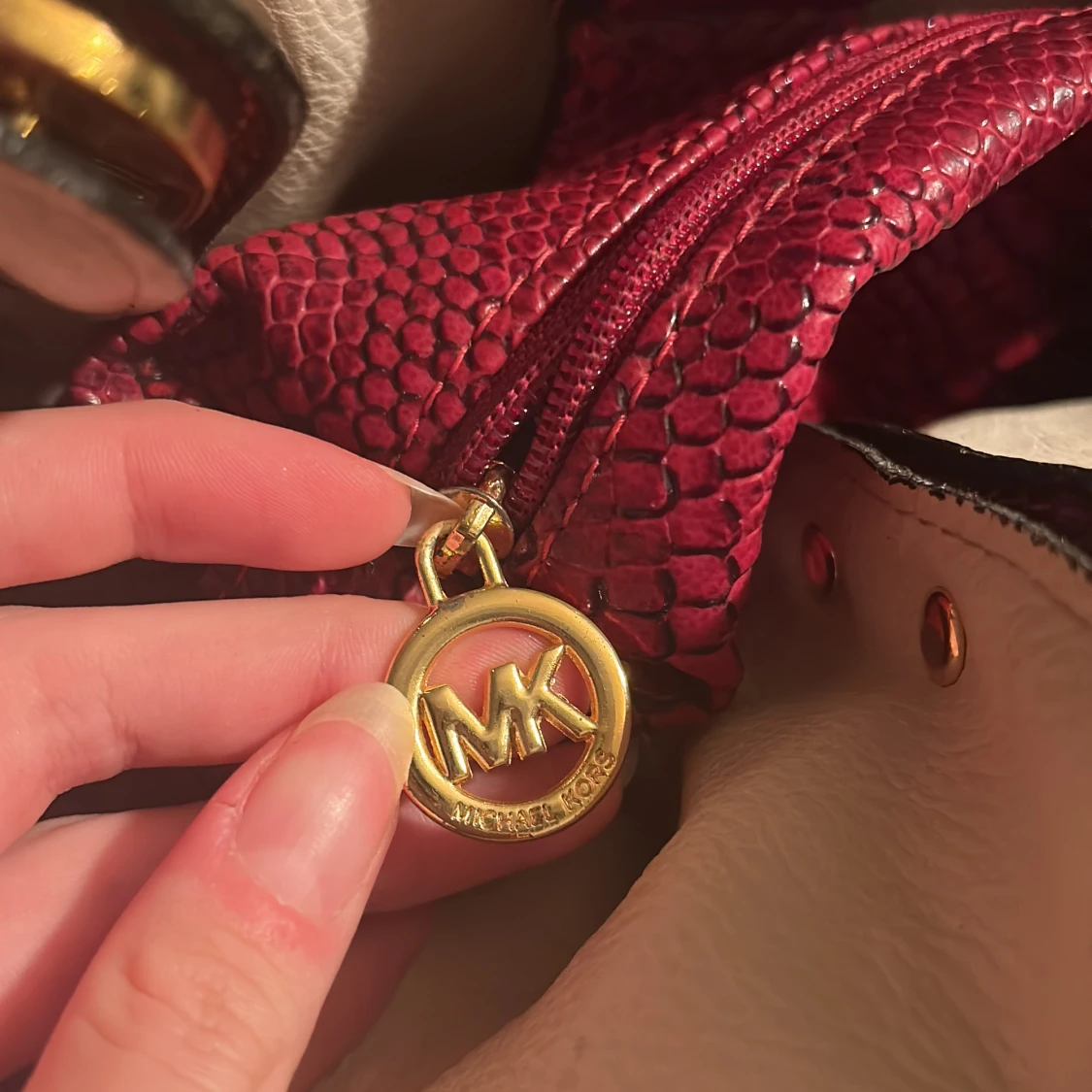Säljer en snygg röd handväska från Michael Kors med ormskinnsmönster och detaljer i beige. Väskan har guldfärgade metalldetaljer, innerfack med dragkedja och klassisk MK-logga. Perfekt för dig som vill sticka ut med en unik accessoar.