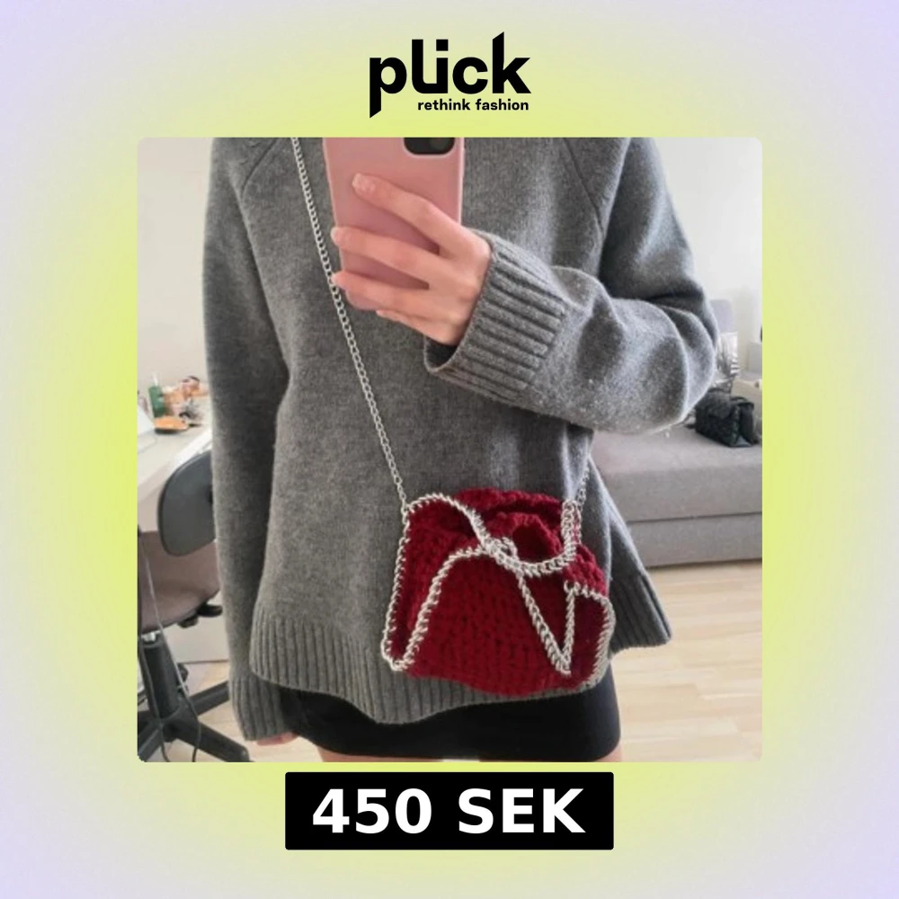 Säljer en snygg röd stickad axelväska med silverfärgad kedja som axelrem och runt kanterna. Perfekt för dig som vill ha något unikt och trendigt.