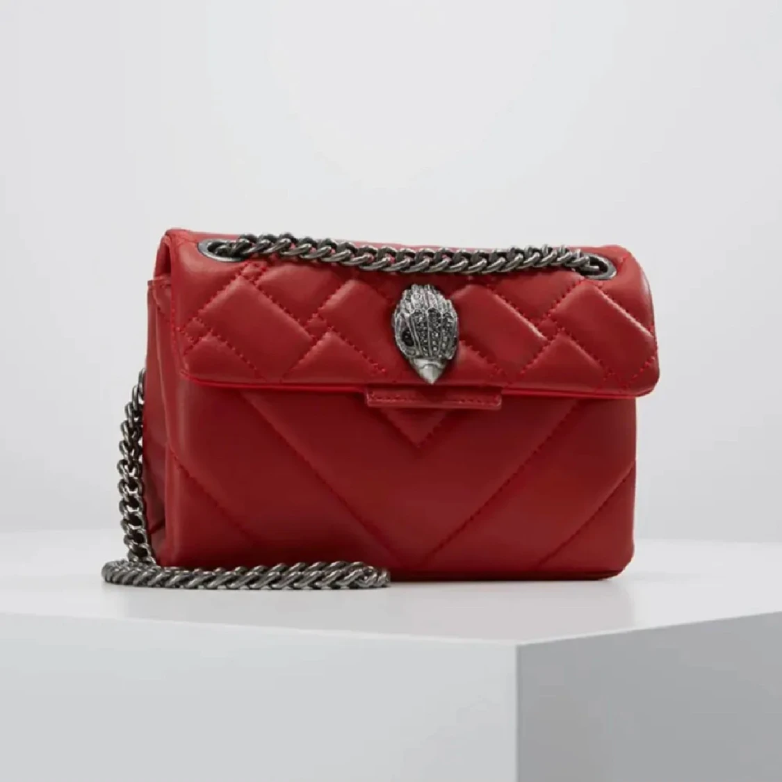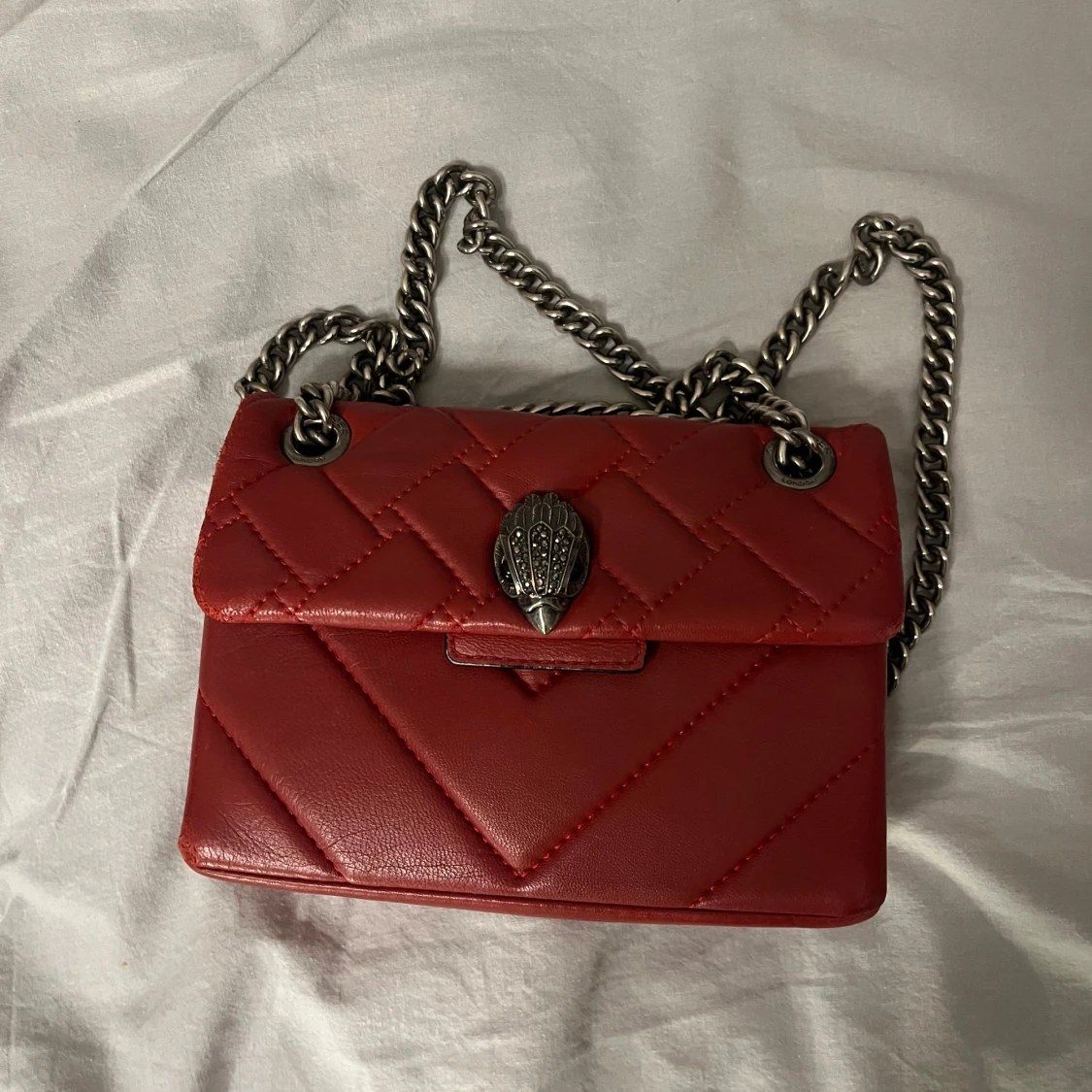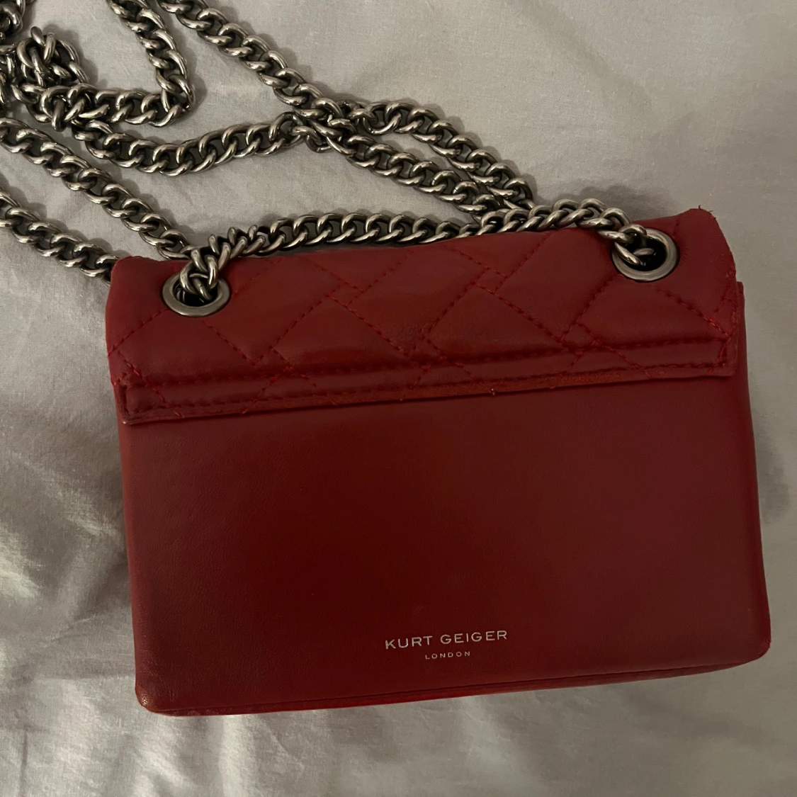Snygg röd axelväska från Kurt Geiger med quiltad design och en cool kedjerem. Väskan har en unik metallspänne framtill som ger den en extra edge. Den har små defekter som knappt märks! Perfekt för att lyfta vilken outfit som helst! Priset går att diskutera vid snabb affär!