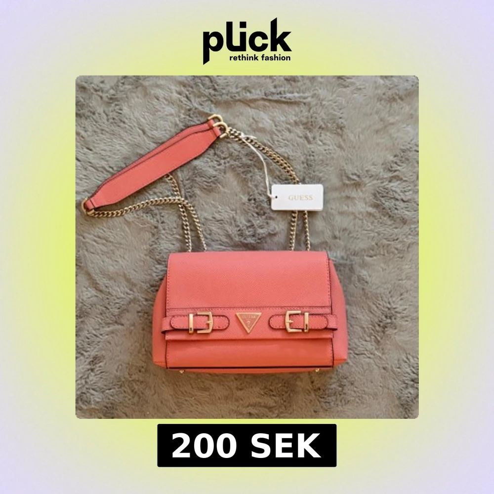 Snygg rosa axelväska från Guess med gulddetaljer och kedjeaxelrem. Väskan har ett stilrent design med två dekorativa spännen framtill och Guess-logotypen i mitten. Perfekt för att ge en färgklick till din outfit!