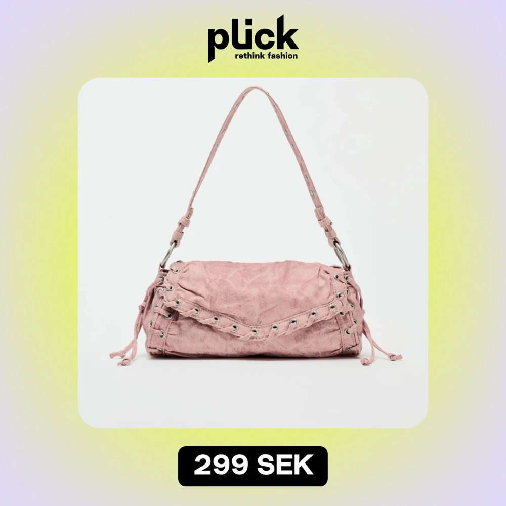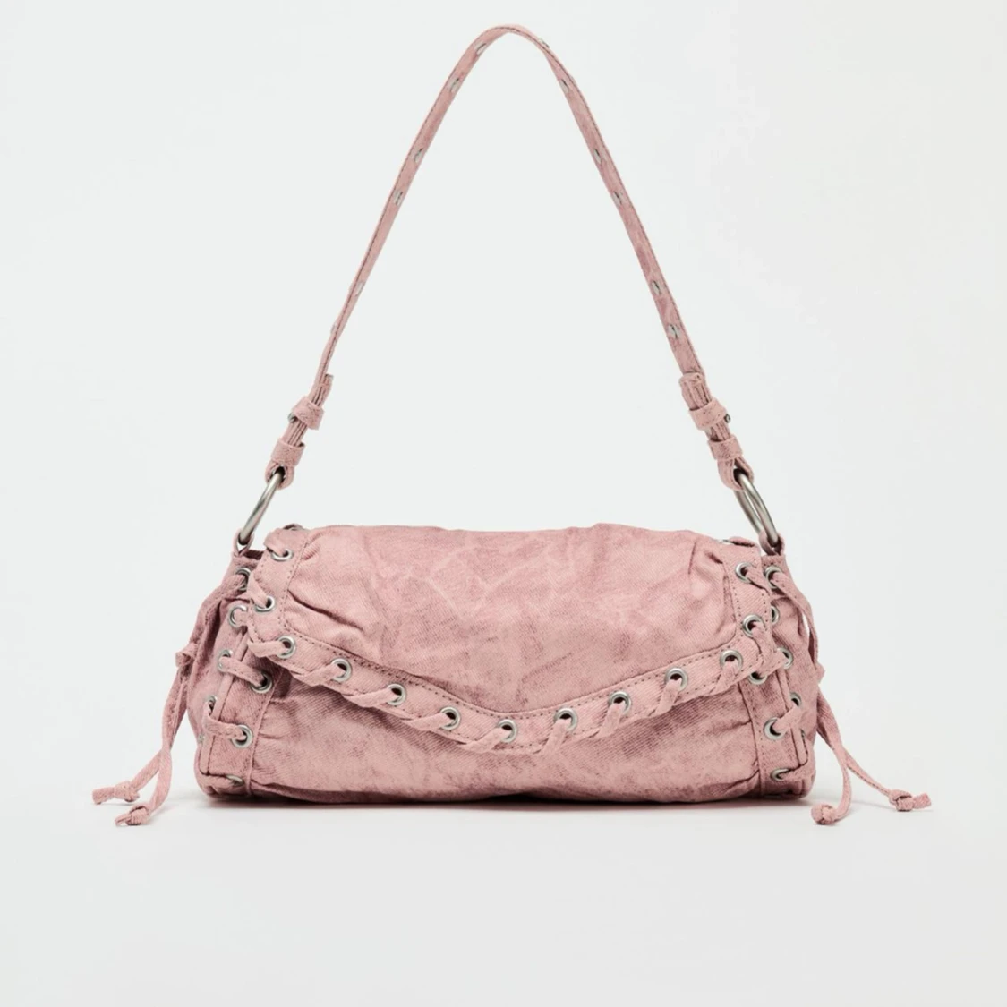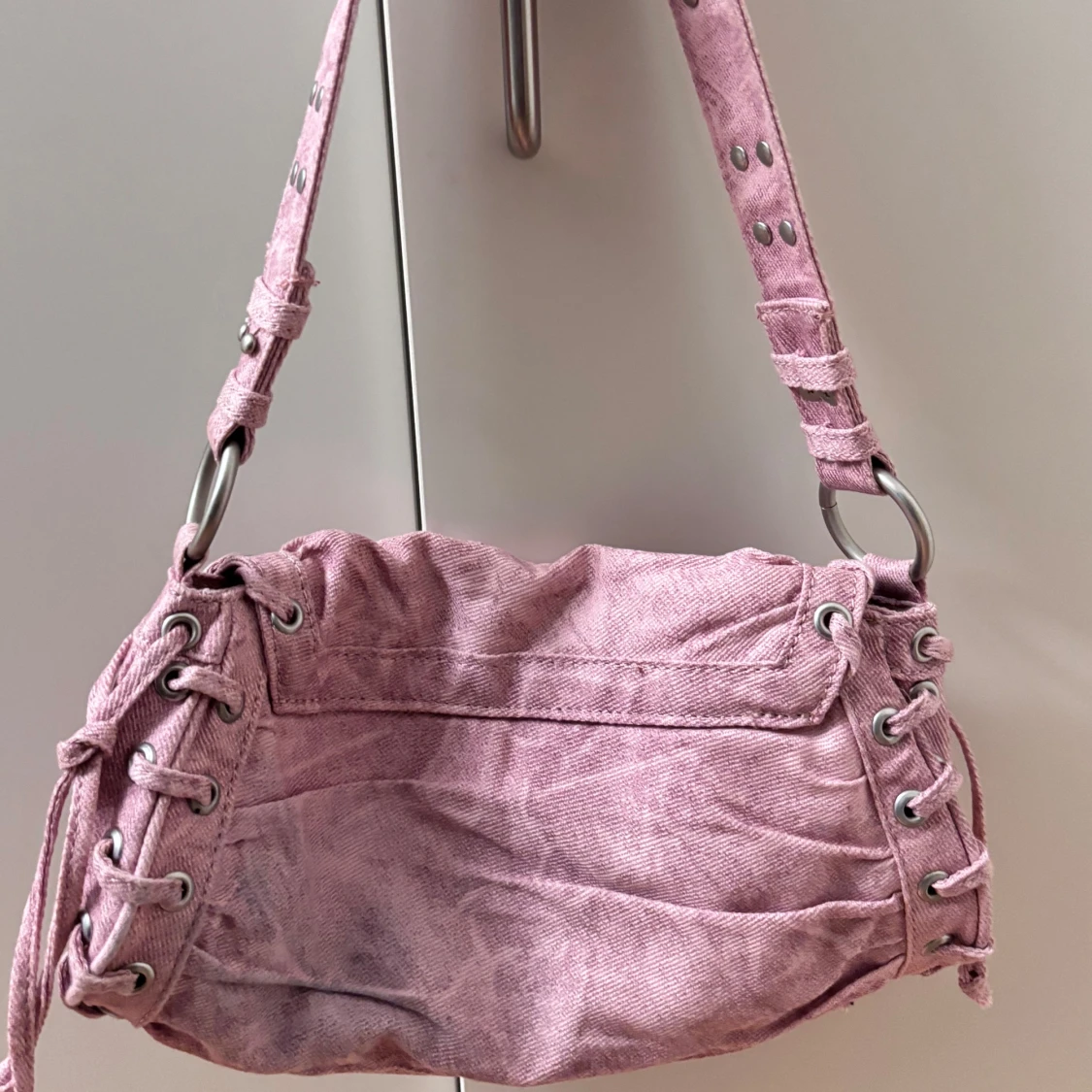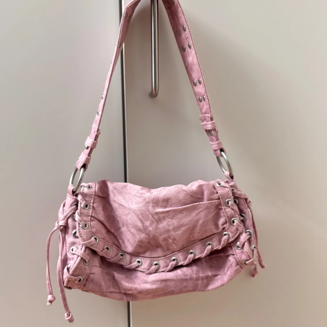 Säljer en superfin rosa axelväska i syntetmaterial. Väskan har coola snördetaljer och en justerbar axelrem. Perfekt för både vardag och fest! 💖