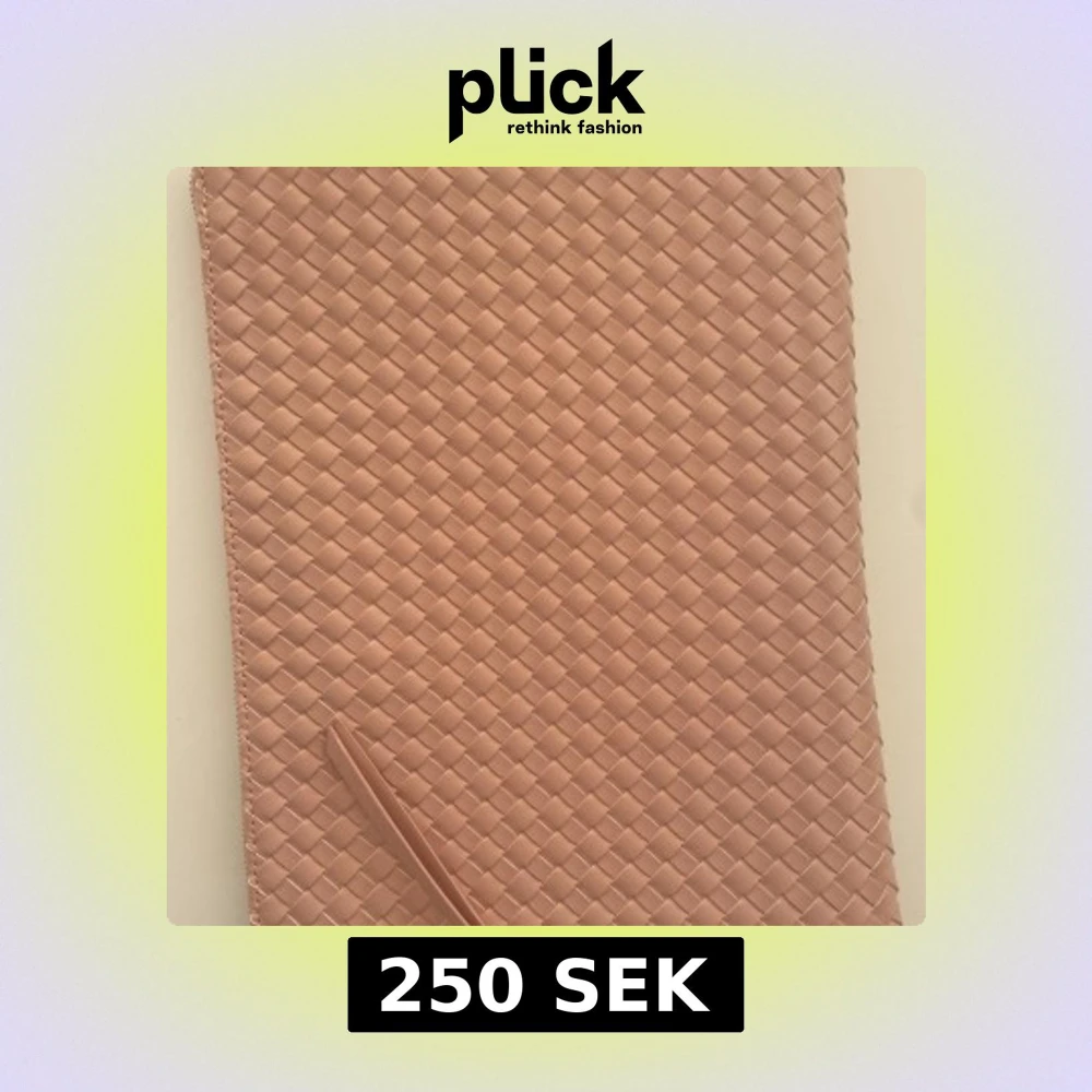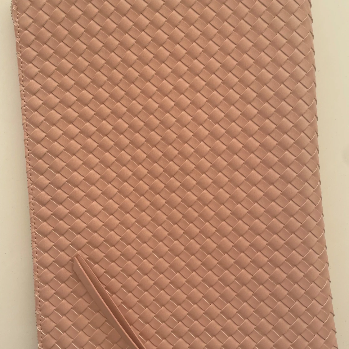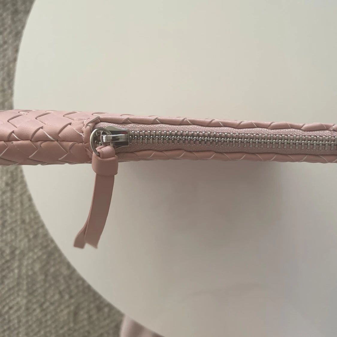 Snyggt rosa datorfodral med flätat mönster och dragkedja.