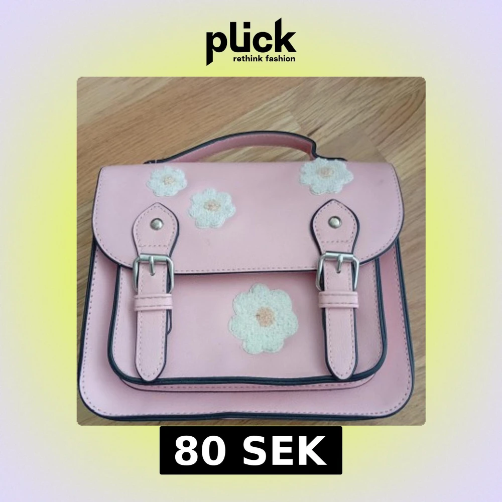 Supergullig ljusrosa handväska med broderade vita blommor på locket. Väskan har ett klassiskt skolväskesnitt med två spännen framtill och ett handtag upptill. Tillverkad i syntetmaterial och har svarta kanter som kontrast.