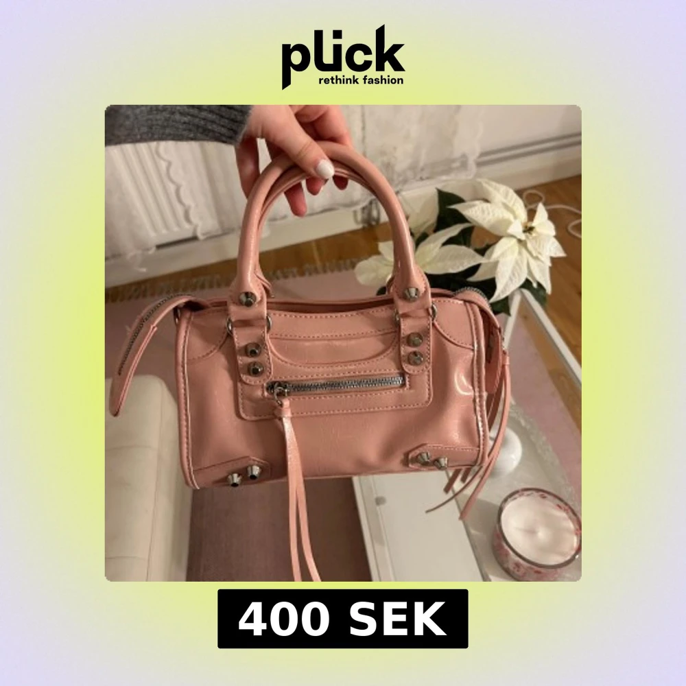 Söt rosa handväska i glansigt skinnliknande material med silverfärgade nitar och dragkedja framtill. Väskan har två handtag och dekorativa remmar samt en innerficka.