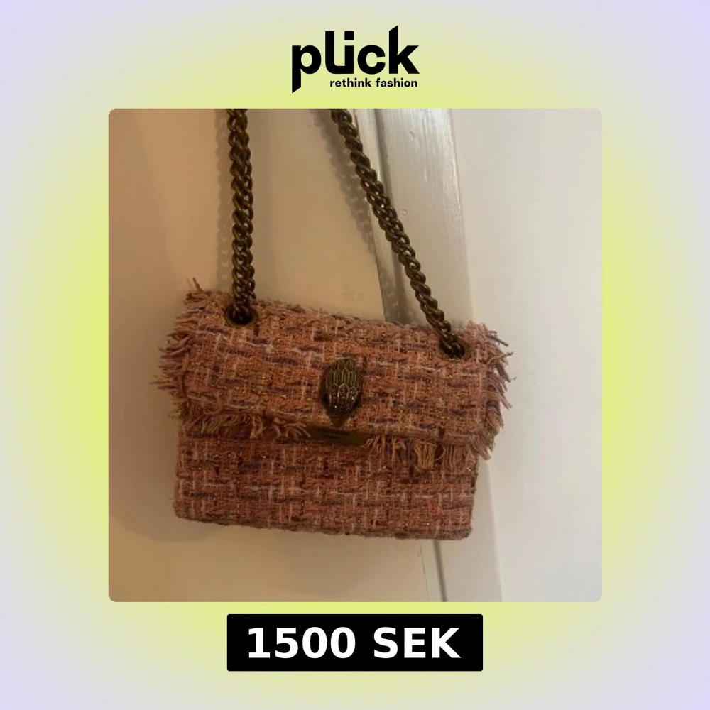 Säljer en snygg rosa axelväska från Kurt Geiger London. Väskan har ett grovt vävt tyg med inslag av guldtråd och fransiga kanter. Kedjerem i metall och dekorativt spänne framtill.