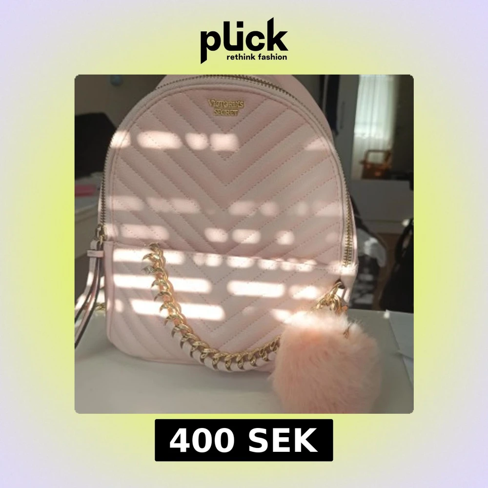 Supersöt ljusrosa ryggsäck från Victoria's Secret med quiltad yta och guldfärgad kedjedetalj framtill. Väskan har dragkedja, randigt foder och en fluffig pompom som accessoar. Perfekt storlek för vardagens essentials och snygg att bära på ryggen. Jag köpte den från Victoria secret några år tillbaka och har knappt använt den. Den är helt slutsåld överallt och man kan inte hitta den typen längre. Finns en liten fläck längst ner på framsidan men inget man märker direkt.