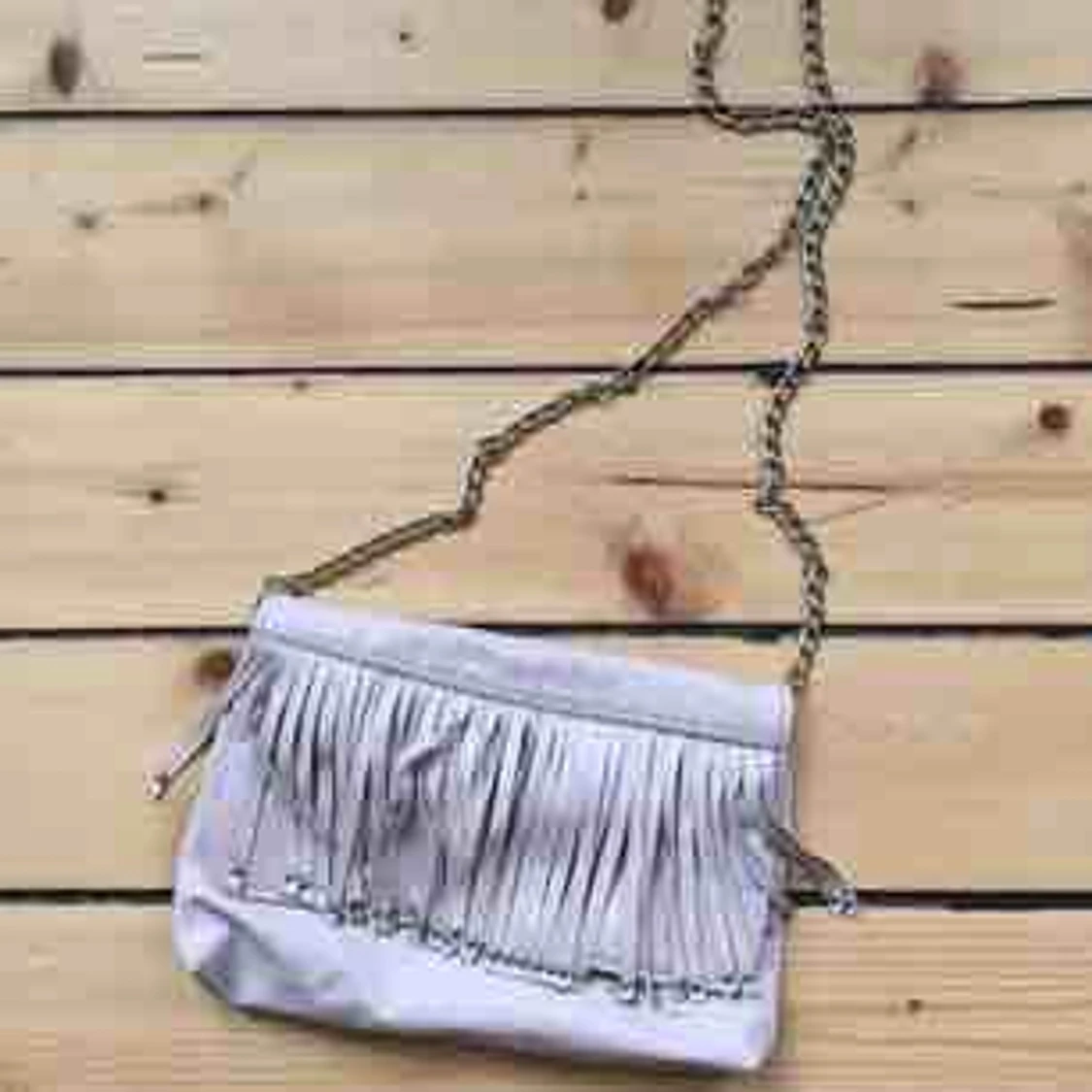 Liten handväska/axelväska i "gammeldags"rosa skinnimitation med fransar och kedja.