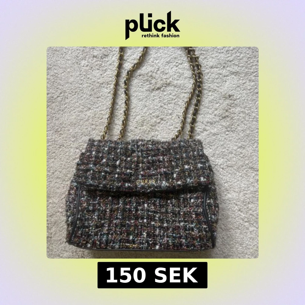 Säljer en snygg axelväska från Guess i rutigt, flerfärgat tyg med inslag av svart, vitt, guld, rött och blått. Väskan har en guldfärgad kedjerem och Guess-logga framtill.