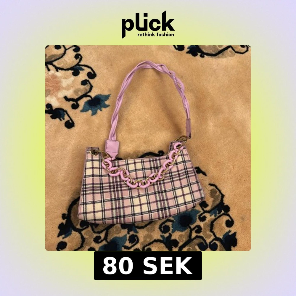 Säljer en söt axelväska i rutigt mönster med lila och beige toner. Väskan har en tvinnad axelrem i lila syntet och en dekorativ kedja framtill. Perfekt för att lyfta en outfit med lite färg och mönster.