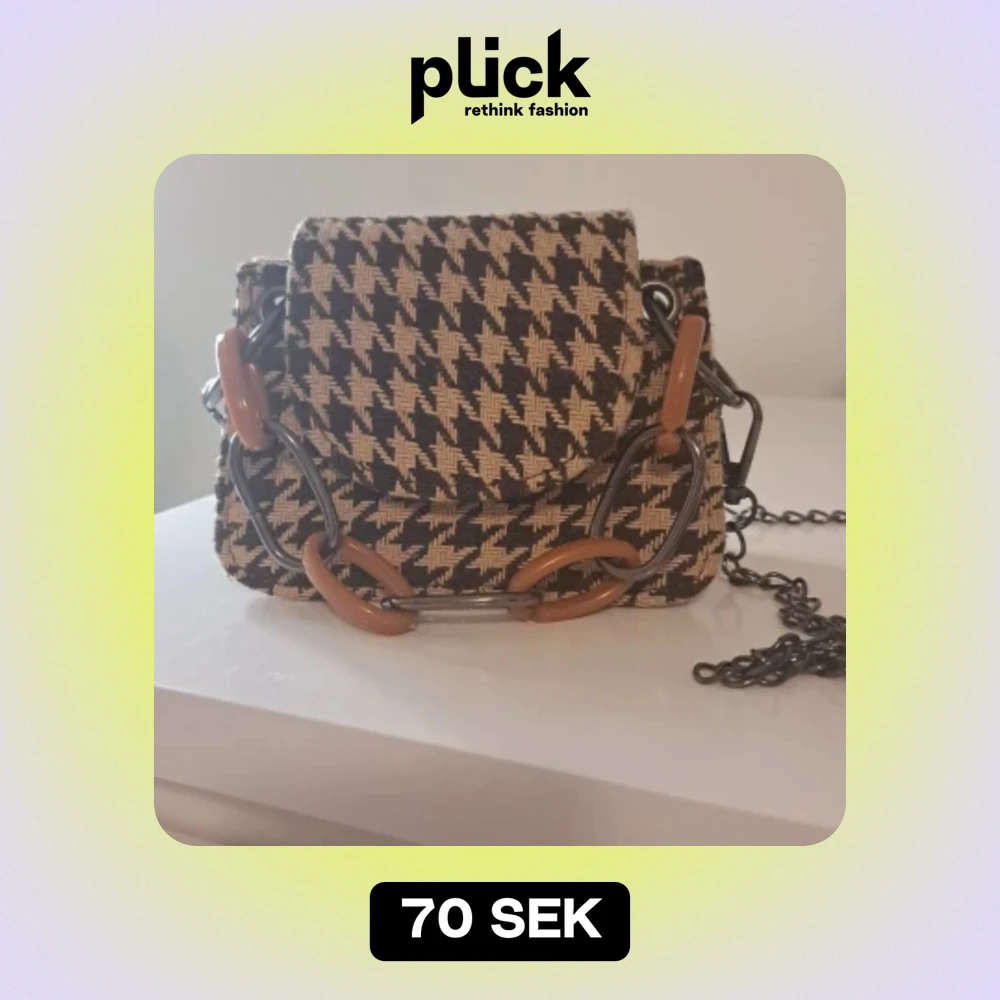 Säljer en supercool axelväska med ett klassiskt rutigt mönster i svart och beige. Väskan har en unik kedja med stora länkar i brunt och metall, vilket ger den en edgy look. 100% nytt och oanvänd. Den är mini väskan. Köpte den för 150. Utan kjedian.