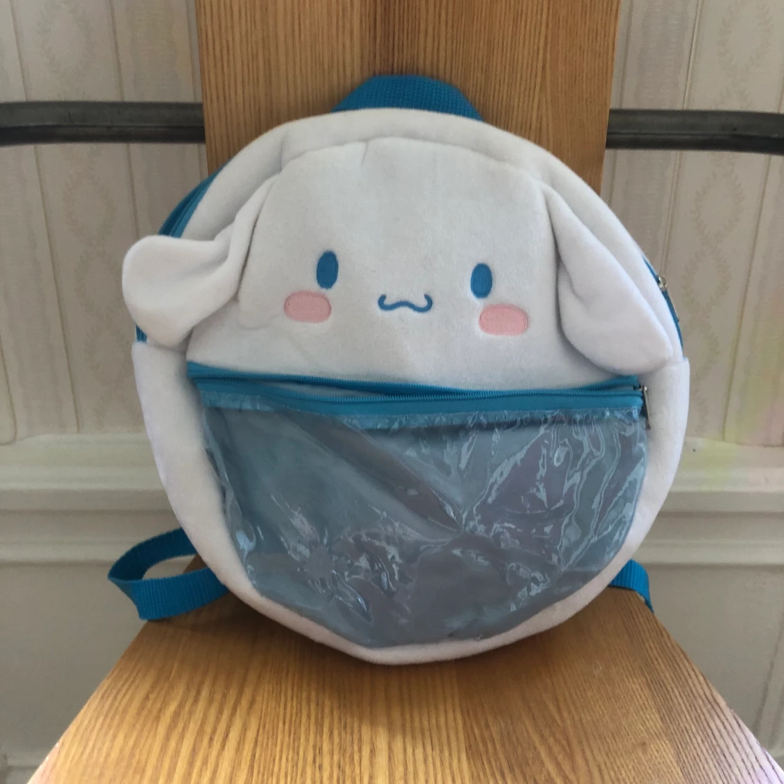 säljer min oanvända cinnamoroll ryggsäck. den har genomskinligt fack så den kan användas som ita bag. den har pyttesmå märken som knappt syns, oklart vart de kom ifrån men går att tvätta bort. extra sanrio grejer medföljer med köp av väskan