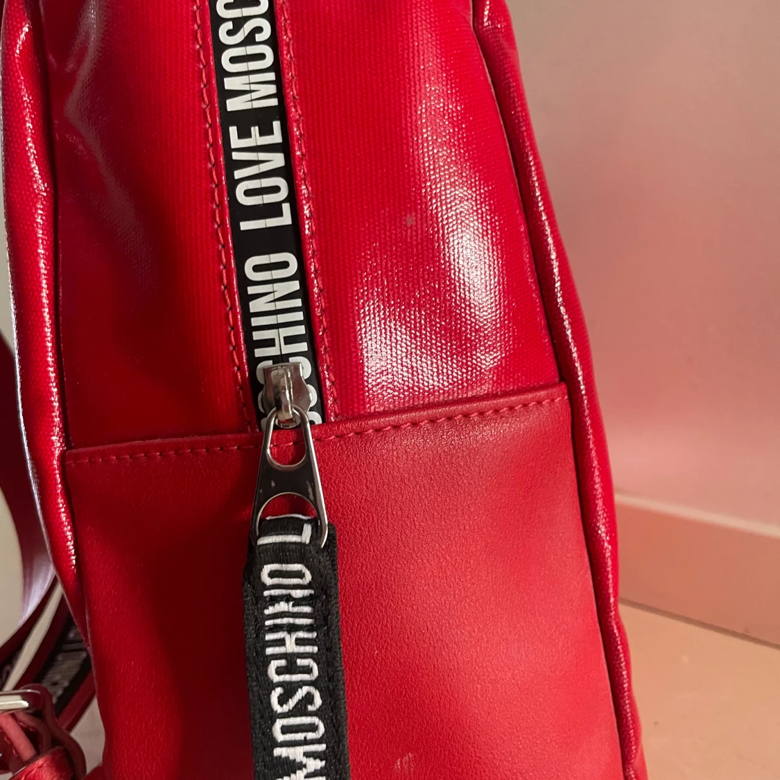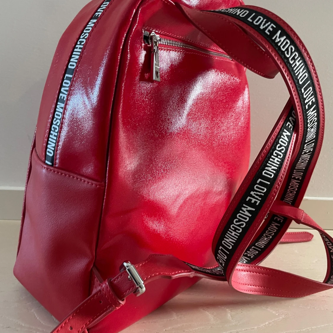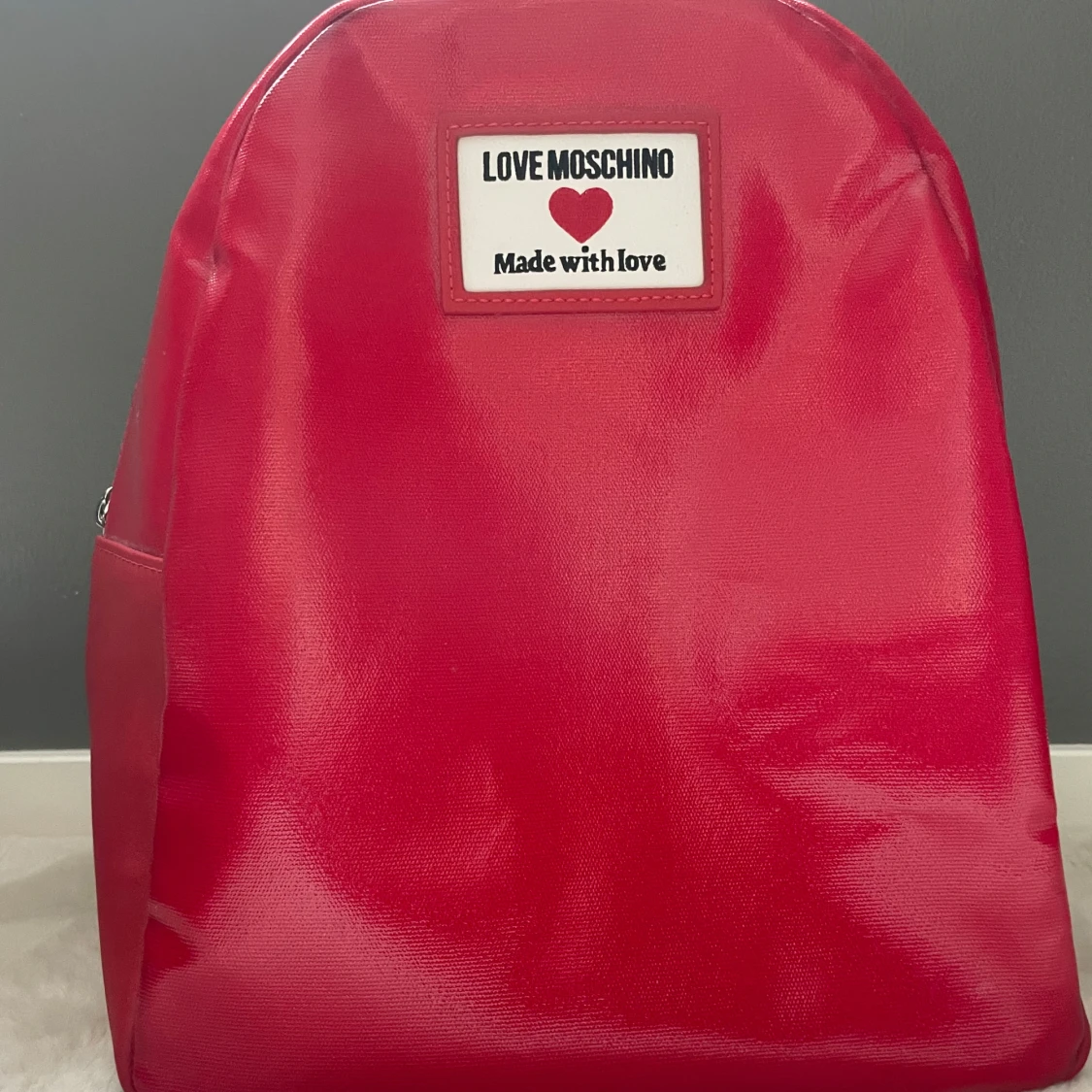 En superfin och sjävklart äkta ryggsäck i konstläder från det italienska lyxmärket Moschino. Storlek 26x31x14cm. Väskan är helt ny alltså den har aldrig använts. Nypris ca 1850 sek.