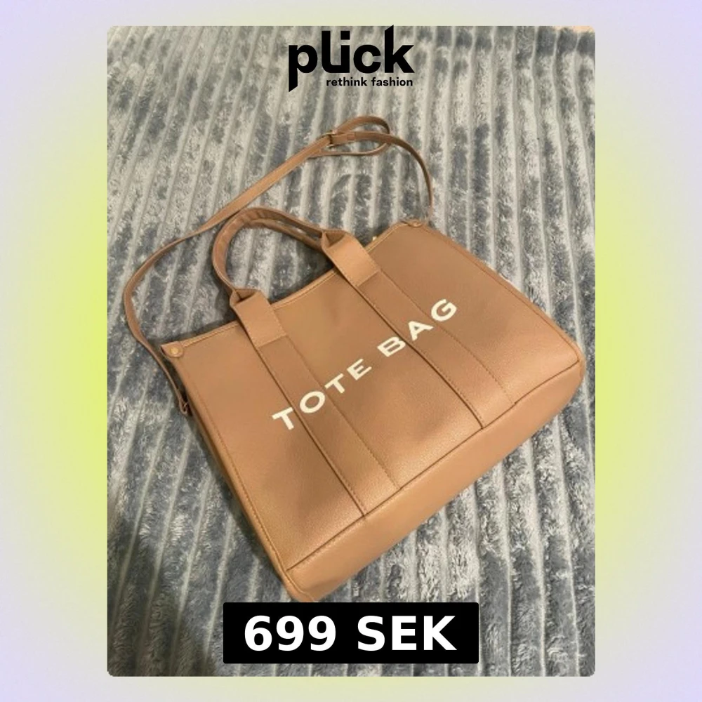 Säljer en beige tote bag med tydlig text på framsidan. Väskan har både handtag och en justerbar axelrem i samma färg. Tillverkad i skinnimitation med stilrena detaljer i guld. Perfekt storlek för att få plats med allt du behöver under dagen.