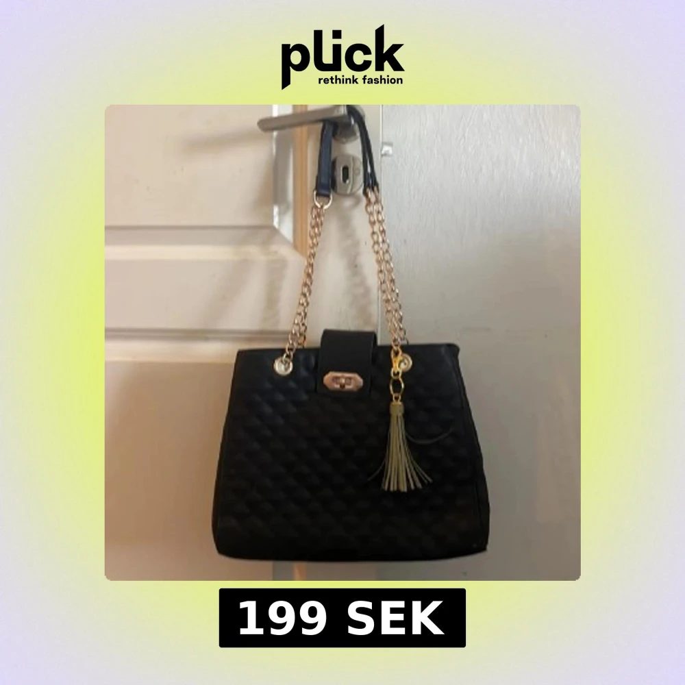Snygg svart handväska med quiltat mönster och guldfärgad kedja som axelrem. Väskan har ett dekorativt hänge med tofs och ett vridlås i guld framtill. Perfekt för att lyfta din outfit med en trendig accessoar.