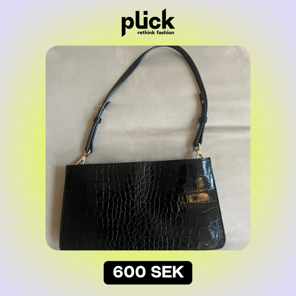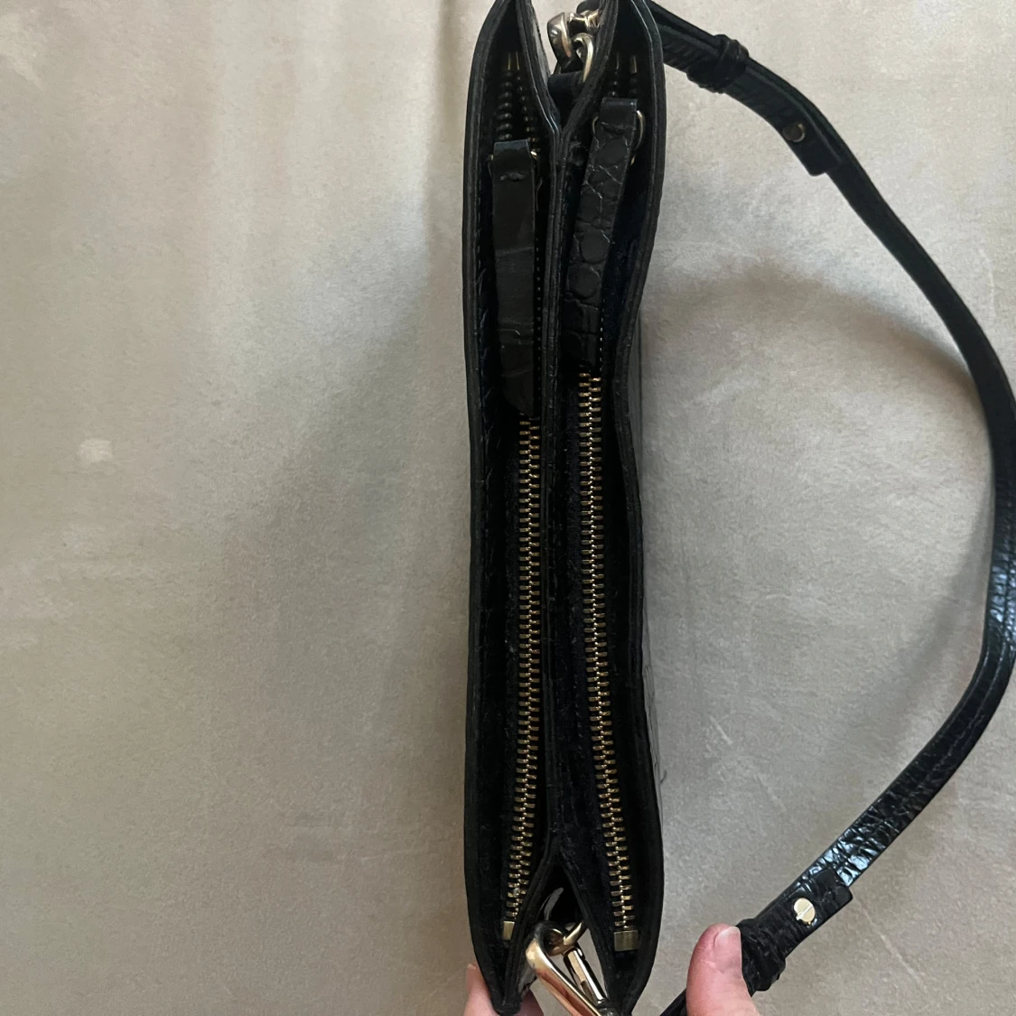 Snygg svart axelväska i skinn med krokodilpräglat mönster. Väskan har en justerbar axelrem och två dragkedjor upptill för säker förvaring. Inköpt för cirka 2-3 år sedan från And other stories i Göteborg.
