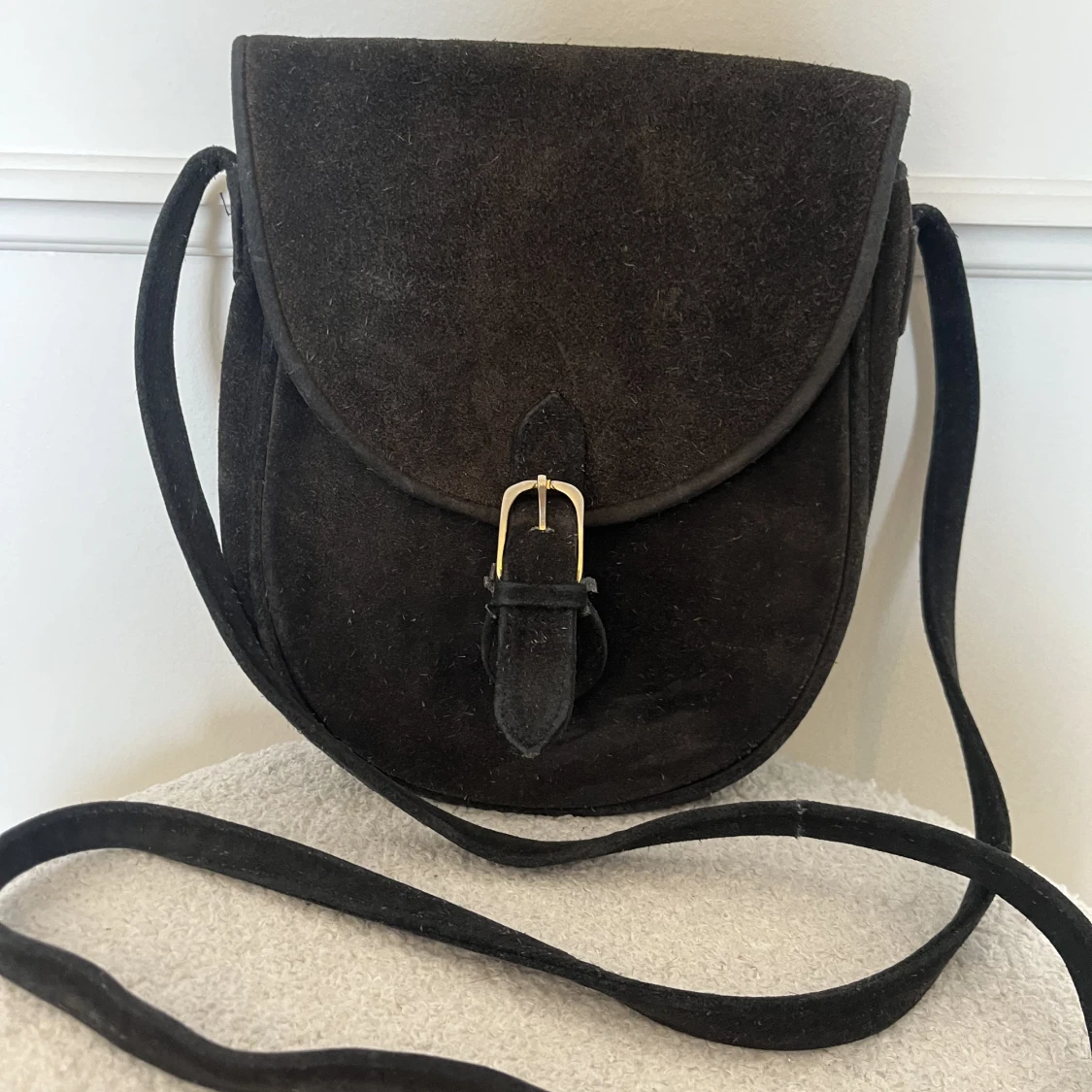 Svart handväska med axelrem.
