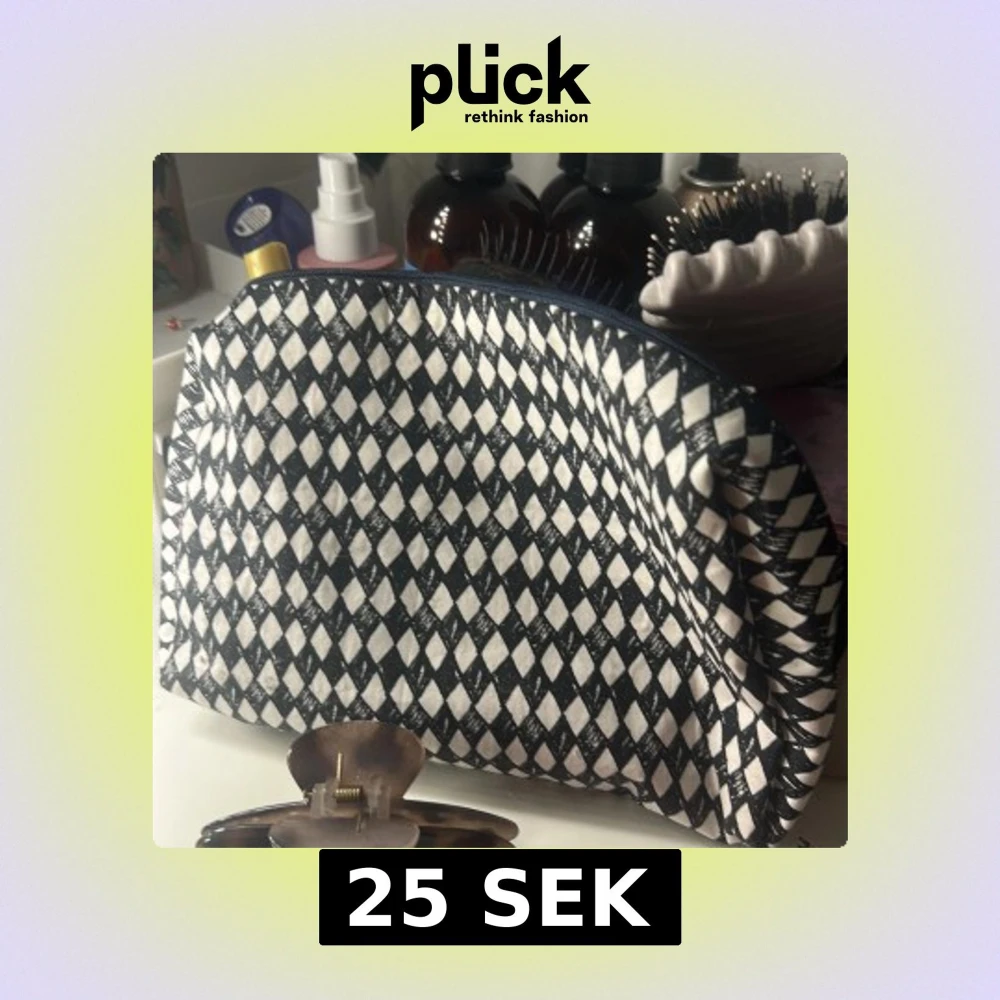 Säljer en snygg necessär med svartvitt diamantmönster på utsidan och rödprickigt foder på insidan. Väskan har dragkedja upptill och är perfekt för att organisera smink eller småprylar. Praktisk och stilren accessoar till badrummet eller resan.